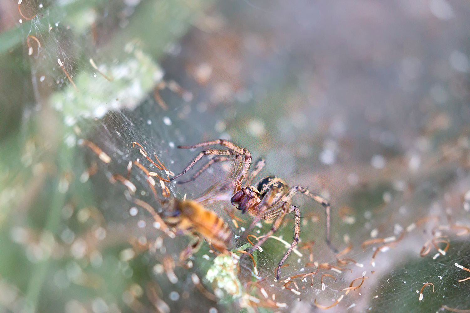 Posto qui questo interessante report fotografico su un attacco di un esemplare di Tegenraria sp. ai danni di un Apis mellifera che era evidentemente in stato moribondo per altri motivi