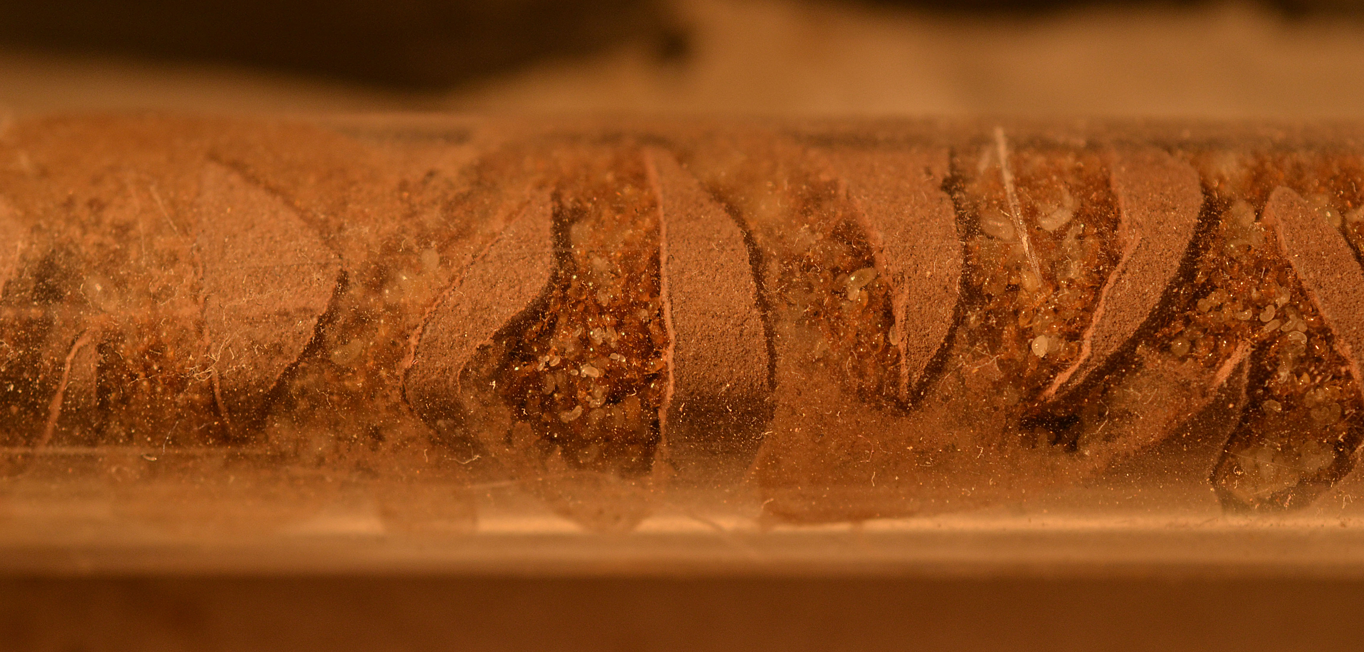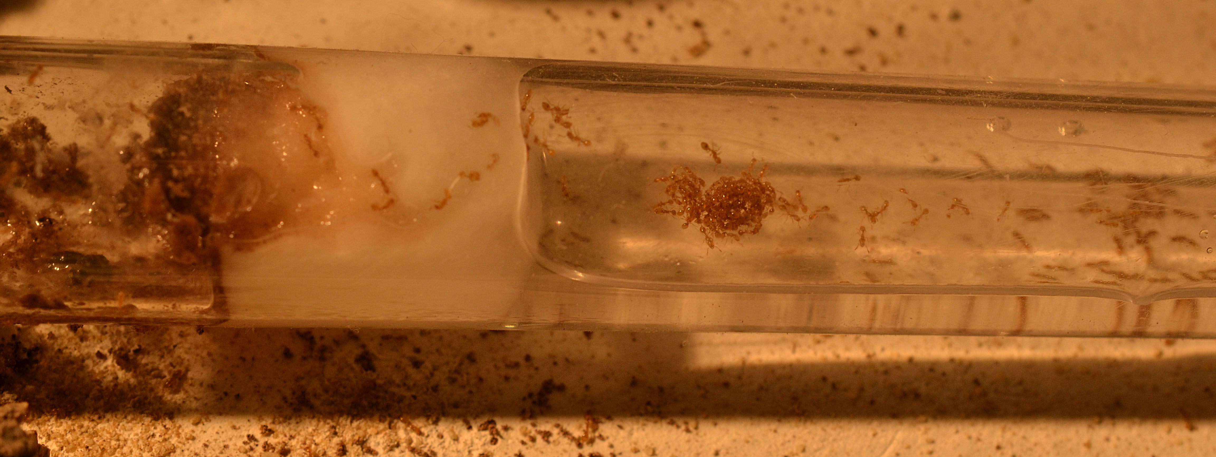 Come previsto la colonia ha 'snobbato' il nido in acrilico, occupando saltuariamente parte delle stanze (quando era presente un'elevata umidità). Durante la mia assenza (causa ferie) hanno invece deciso di occupare una provetta/serbatoio ormai esaurita, sigillandone l'ingresso con detriti vari e polvere di gesso (cercando così di mantenere alta l'umidità all'interno).