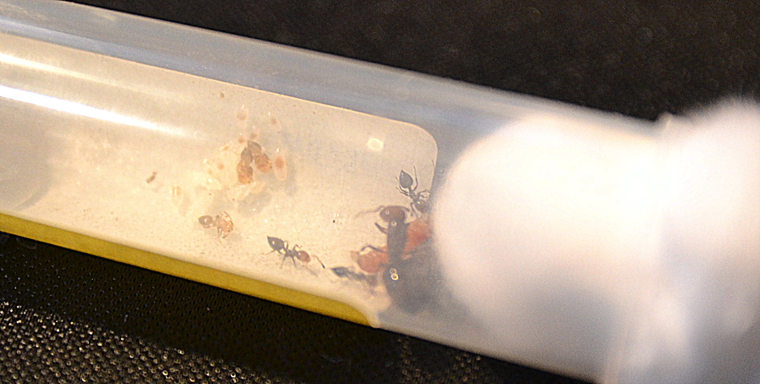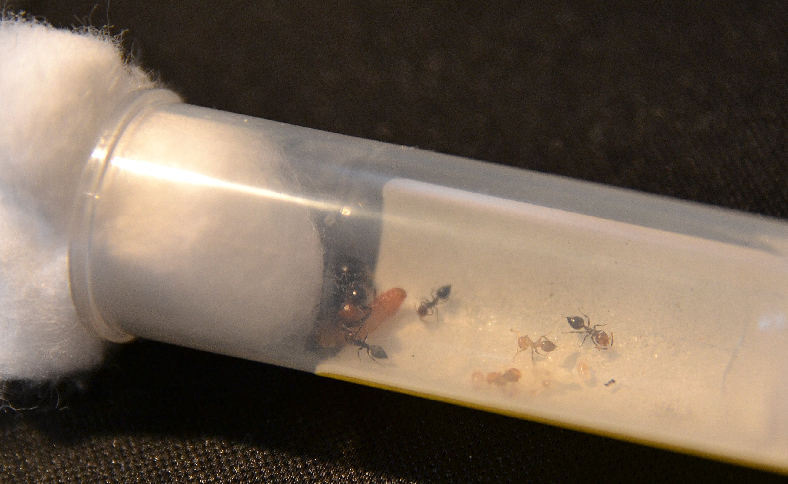 Controllo la regina dopo più di due settimane di "isolamento" e resto piacevolmente sorpreso dallo scorgere almeno 10 uova e altrettante larve ammassate e ben controllate. Noto però anche la formazione di una muffa nera nei pressi del batuffolo bagnato e la riserva d'acqua quasi terminata. Su consiglio di alcuni utenti ho allora effettuato il cambio di provetta, trasferendo la regina grazie alla gravità e la covata (che era rimasta appiccicata al bordo) con uno stuzzicadenti ed un piccolo pennello. Dopo pochi minuti di agitazione sembra che la regina abbia ripristinato l'ordine e risistemato accuratamente larve e uova.
