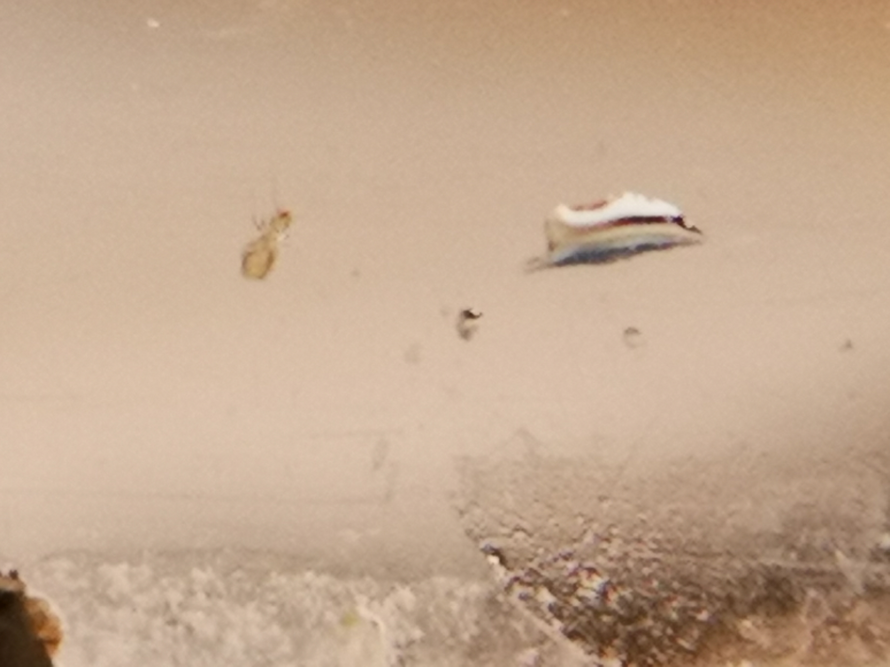 Ciao a tutti! La mia colonia di Messor barbarus va alla grande sembra, proviene dalla Spagna e per mia scelta salta l'ibernazione, detto questo ho notato all'interno dell'arena l'insetto che mostro in foto, piccolo, forse un millimetro o meno, trasparente e ricorda vagamente una tarma ma non saprei.