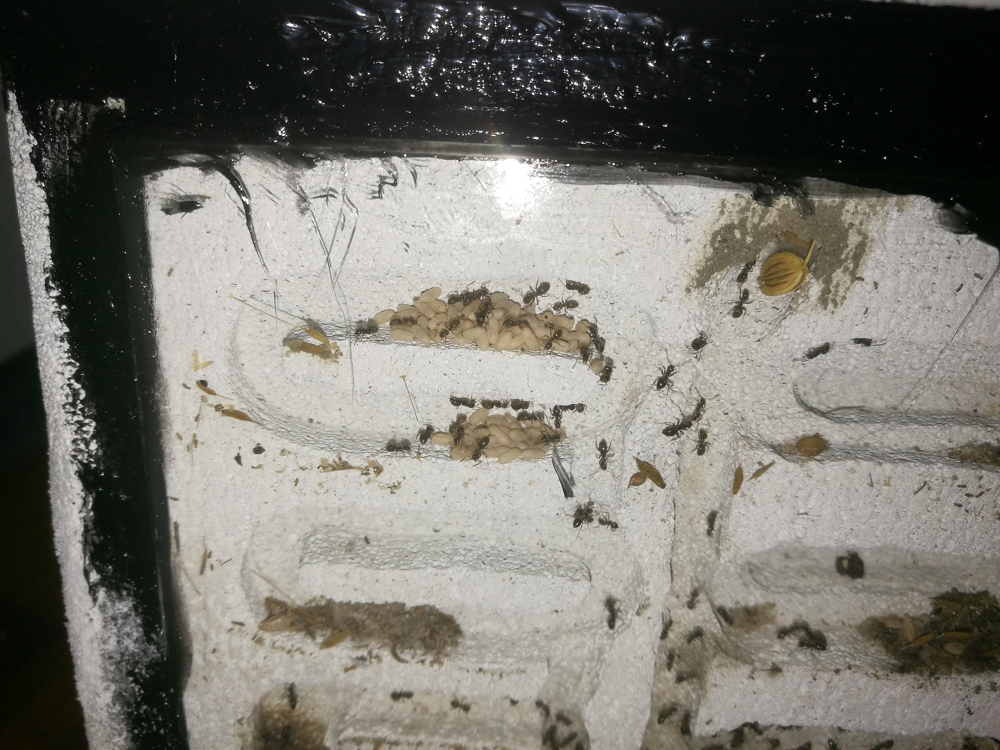 Attualmente credo sia più che spazioso per il numero di operaie presenti, ma quello che mi preoccupa è la quantità di uova, larve, bozzoli che ci sono .