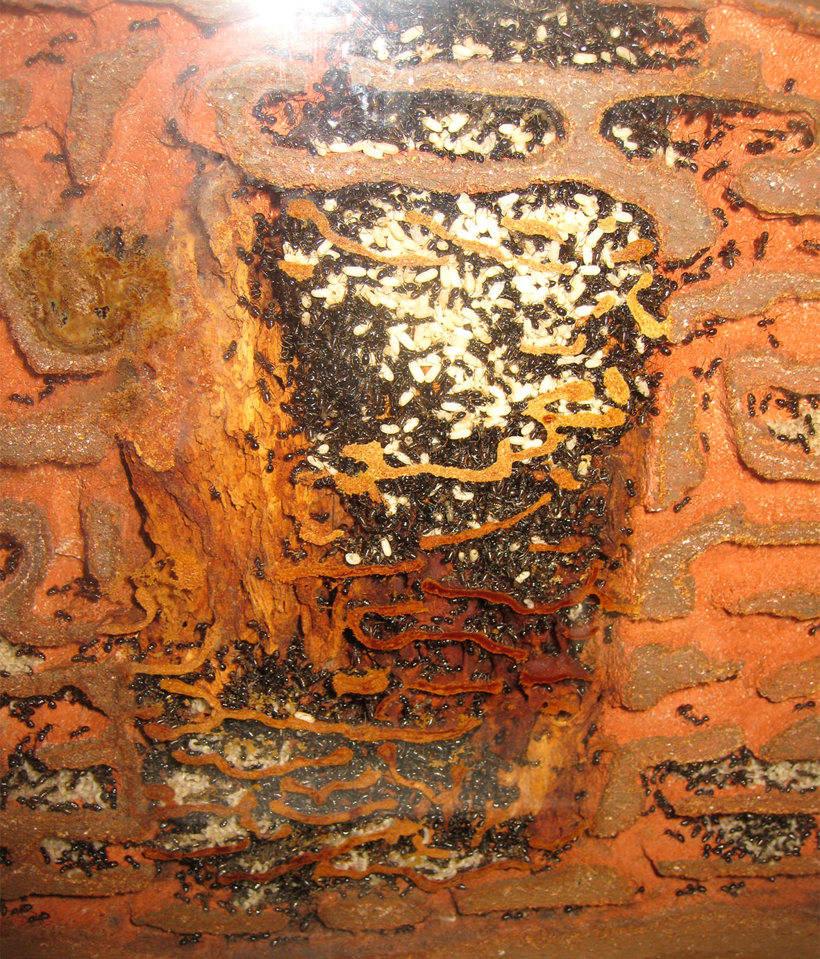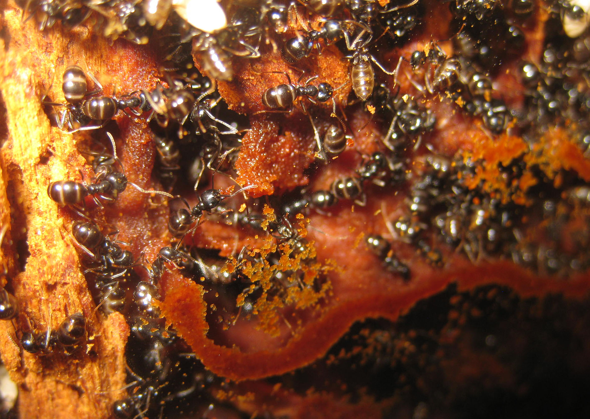 In queste immagini si vede meglio come opera Lasius fuliginosus nella costruzione dei ripiani di cartone masticato. Oltre al trasporto delle schegge di legno lavorato, si può vedere che la maggior parte della cura le formiche la mettono nel "leccare” con la ligula la superficie plasmata. Sembra fondamentale l'apporto di umidità per la lavorazione; si capisce allora perché queste formiche siano così assetate e gradiscano le sostanze zuccherine soprattutto quando sono molto fluide, per operare su così tanto materiale serve non avere la gola secca!