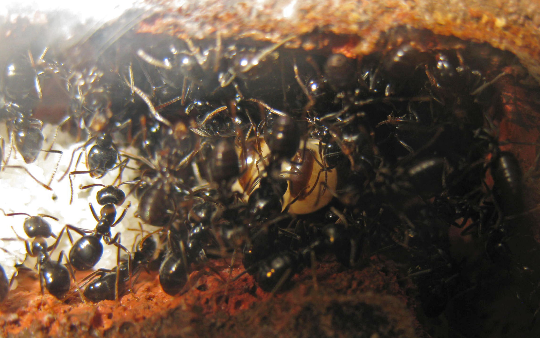 Finalmente mi è dato di intravvedere la regina. Credevo fosse un pezzo di cibo, invece il bianco era l'addome traslucido pieno di uova! E' spaventosa nelle sue sproporzioni; probabilmente non è nemmeno in grado di spostarsi da sola... Con la luce nel verso giusto, si vedono addirittura le uova in trasparenza nel gastro!