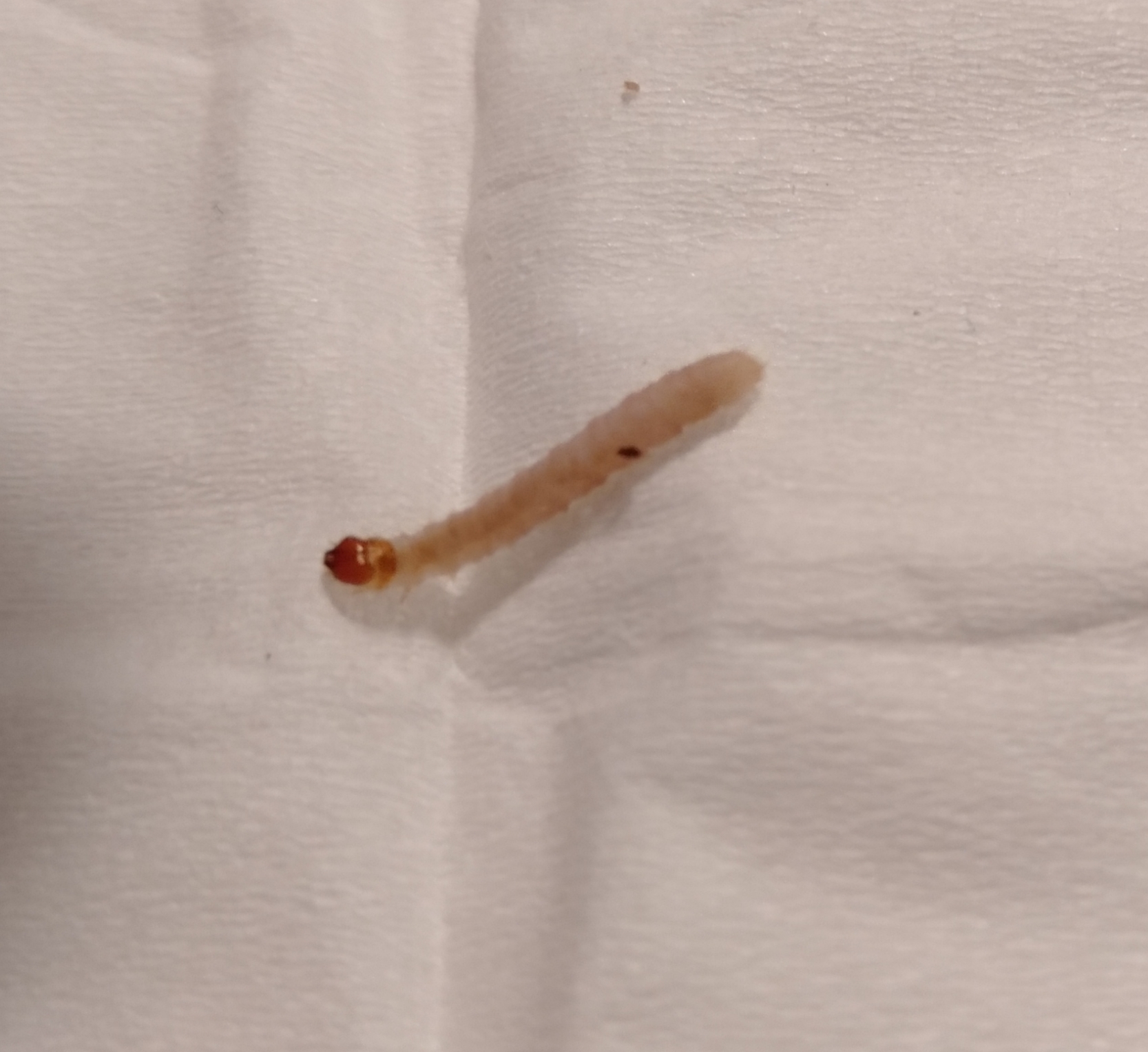 Credo di aver capito. Ho letto che è un parassita. Infatti avevo trovato una piccola camola mentre mangiavo una noce dopo aver fotografato la vespa. L'ho rotta dentro al cesto delle noci quindi non saprei dire se al momento era fuori o dentro la noce. In ogni caso allego l'immagine della camola. Sono davvero sorpreso di come si sia creato l'habitat ideale per Venturia canescens in un posto così impensabile