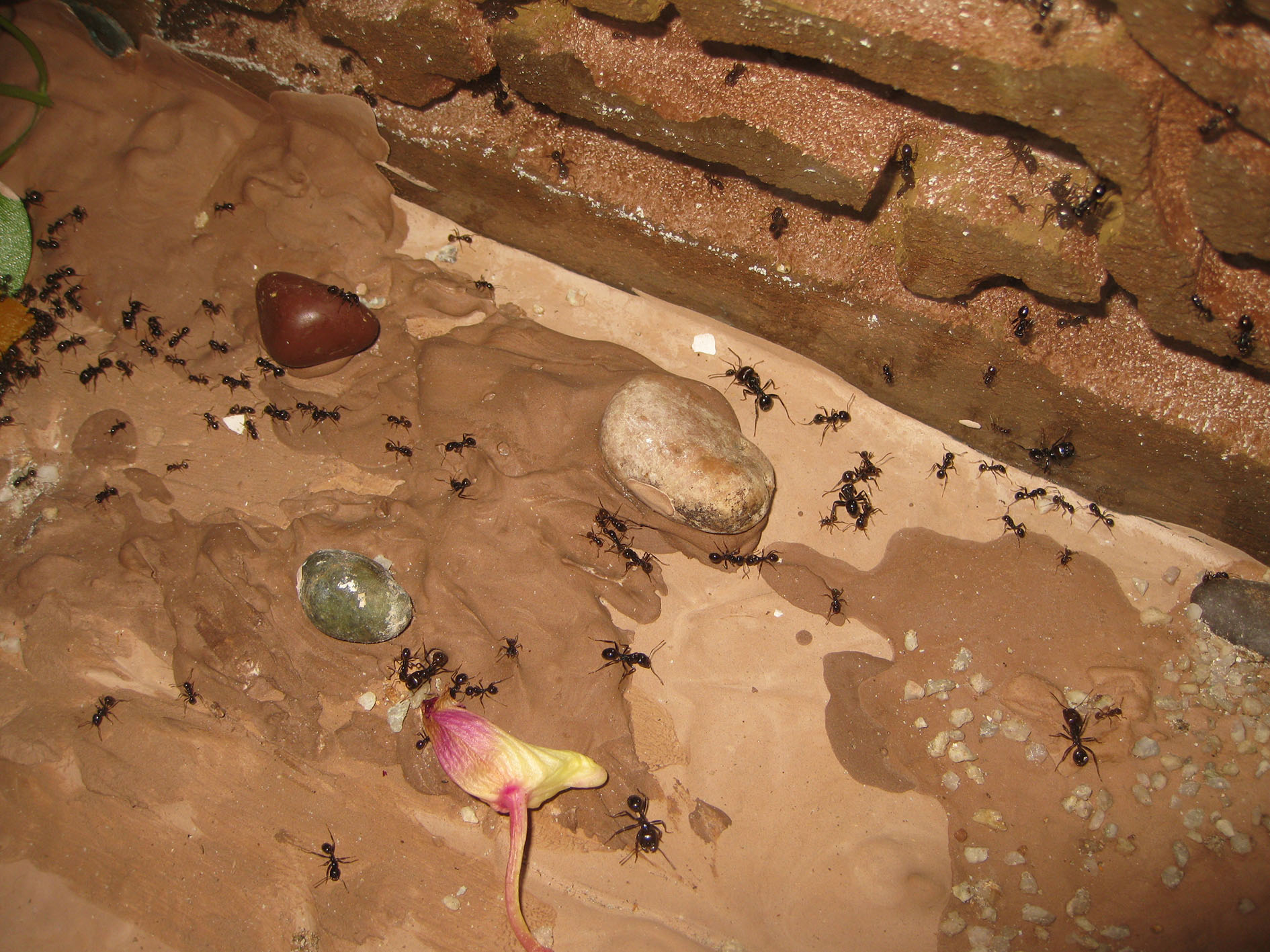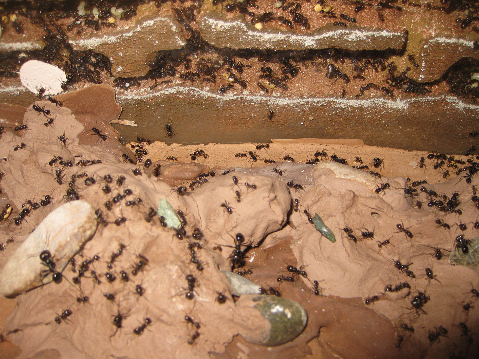 E' interessante vedere che presso le uscite le formiche hanno portato una buona quantità di sassolini, forse per raccogliere l'umidità? Forse un ricordo ancestrale della loro vita libera in cui i sassi bianchi riflettono meglio la luce del sole?