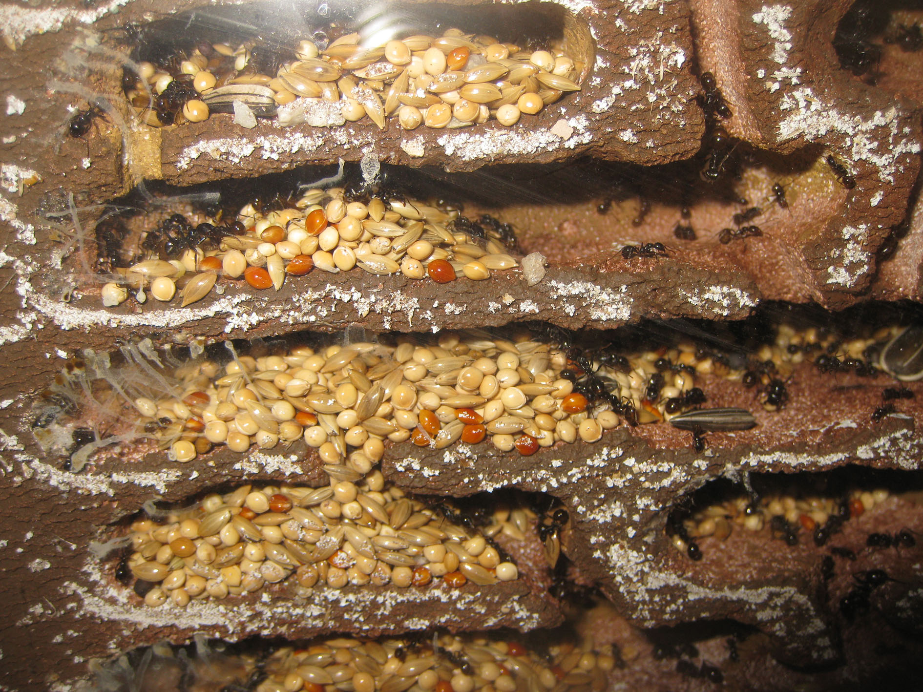 In questo momento sto fornendo alla colonia soprattutto cibo animale, voglio vedere se la quantità di "soldati” aumenta. I semi non mancano, ma ho visto che in presenza di carne le formiche impazziscono e non mobilitano subito la popolazione per portare il bottino nel nido.