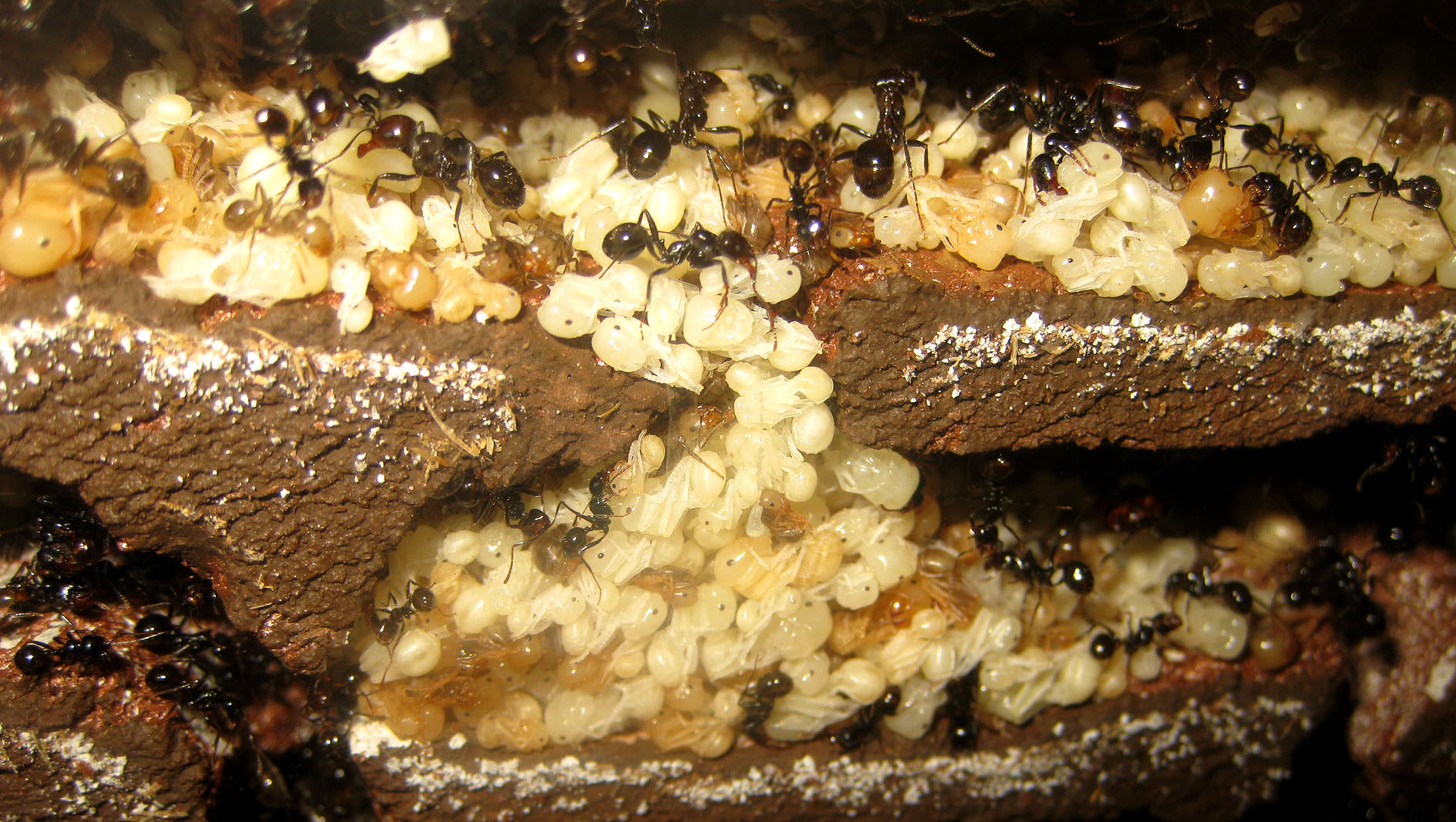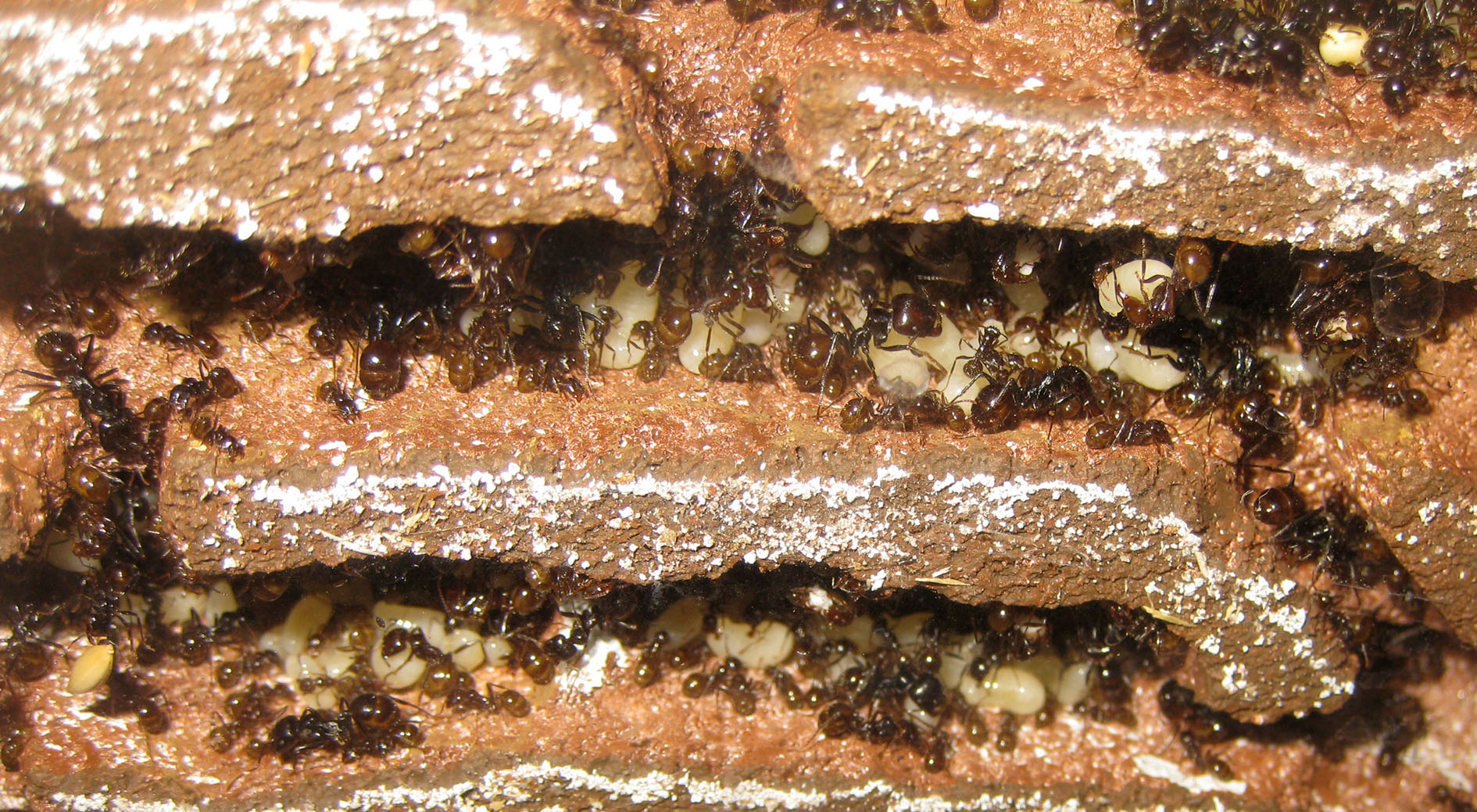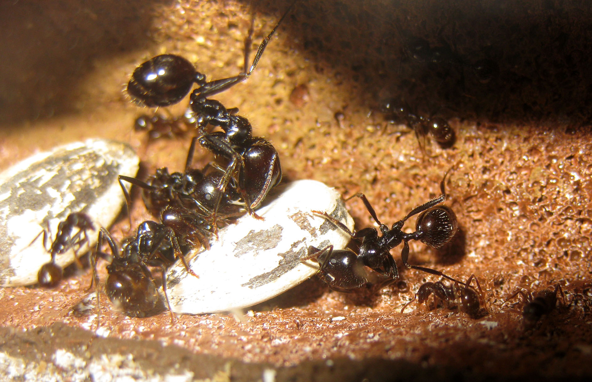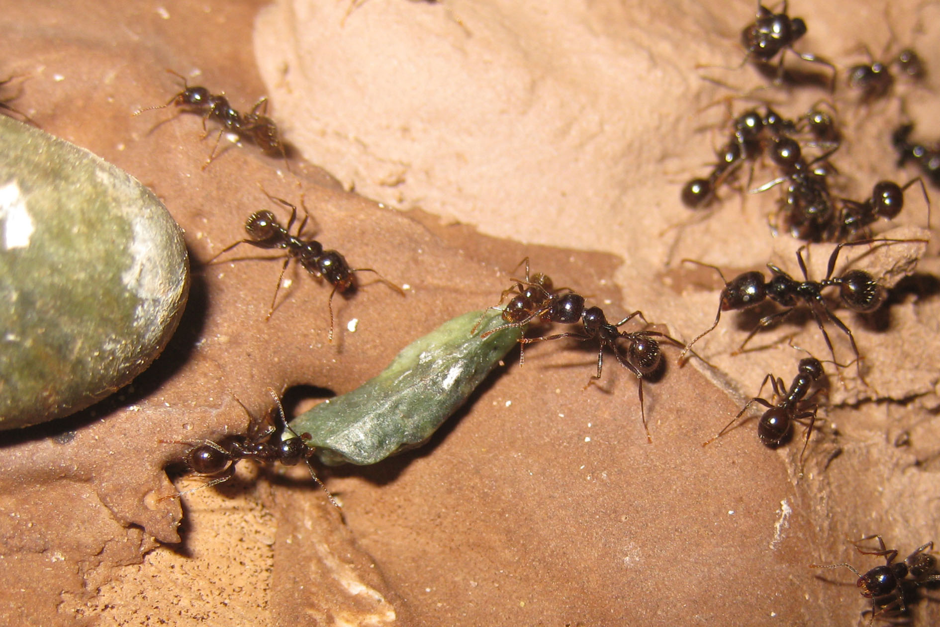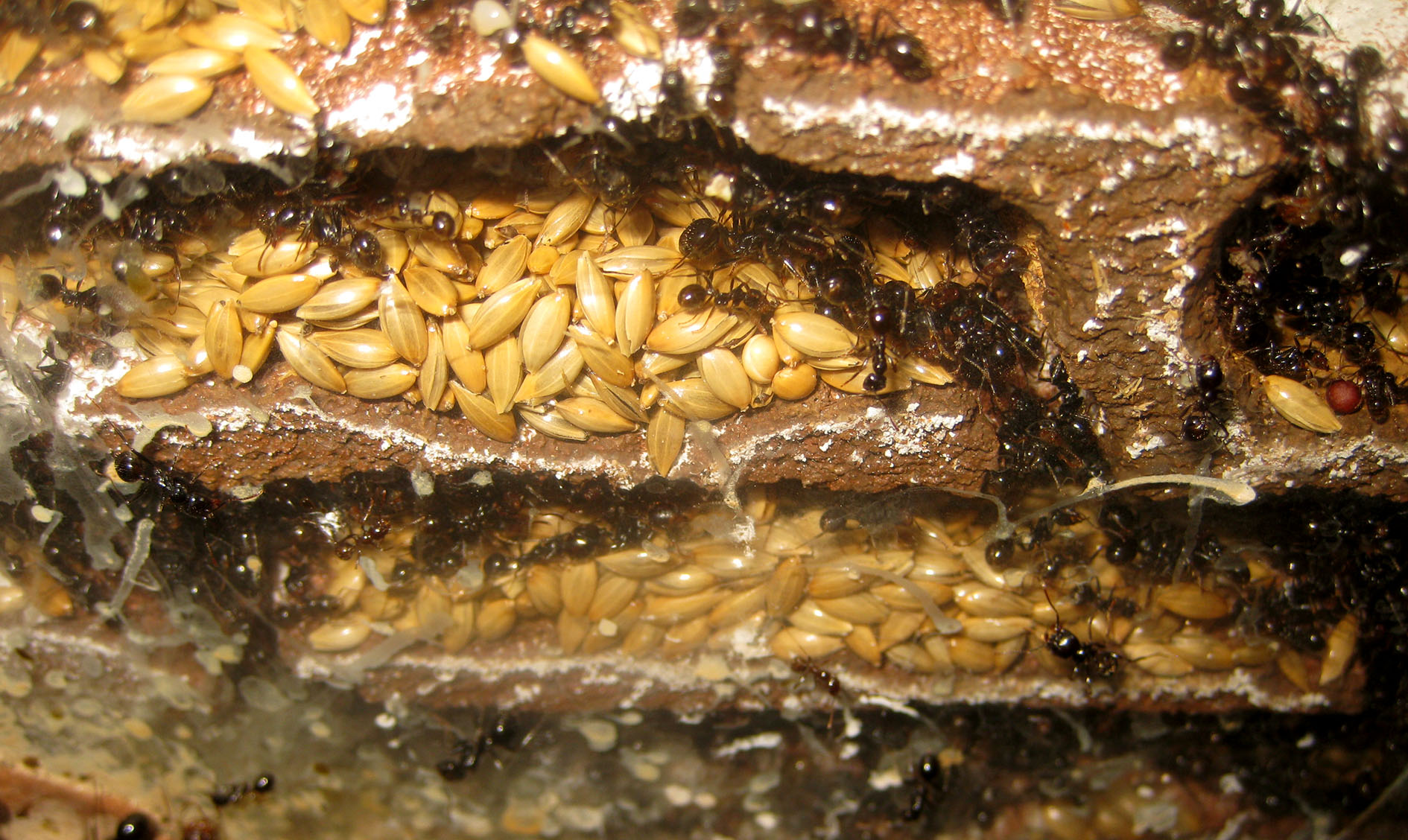 Devo provare a vedere se una fornitura di acqua più regolare ed abbondante influisce su questo comportamento oppure se le formiche sono comunque attirate fuori se bagno semplicemente il terreno. Potrebbe essere uno degli stimoli esterni che regola anche le fasi di sciamatura autunnale, muovendo verso l'esterno grandi masse di formiche, ma questo varrebbe anche per Messor capitatus, no?