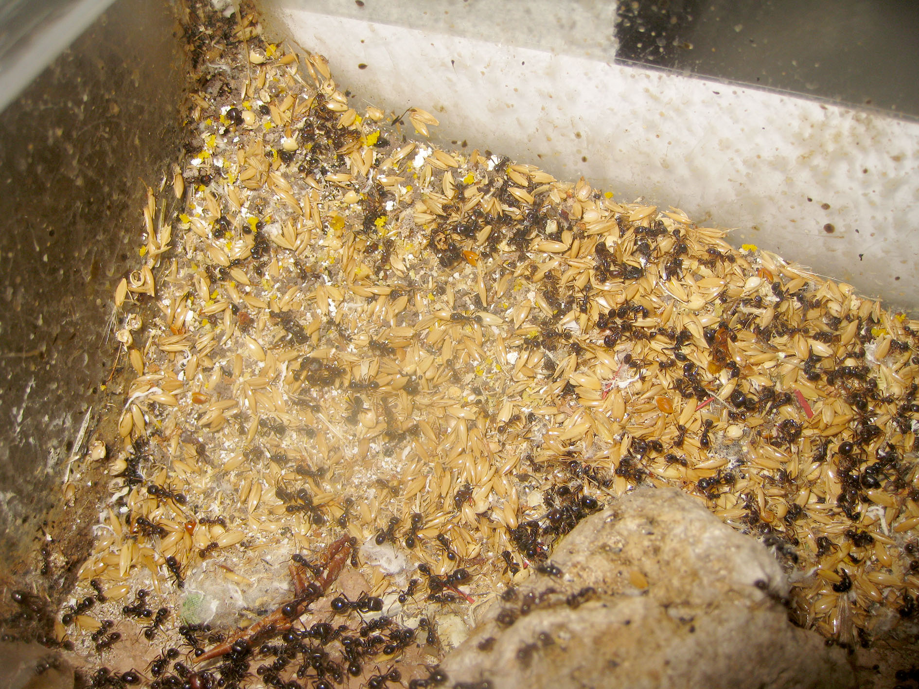 Sto pensando di mettere in ibernazione la colonia appena possibile, in modo da rallentarne la crescita e per dar modo alla regina di tirare un po' il fiato. Per ora continuo a tenere ben alimentata la popolazione, con una predilezione verso i semi.