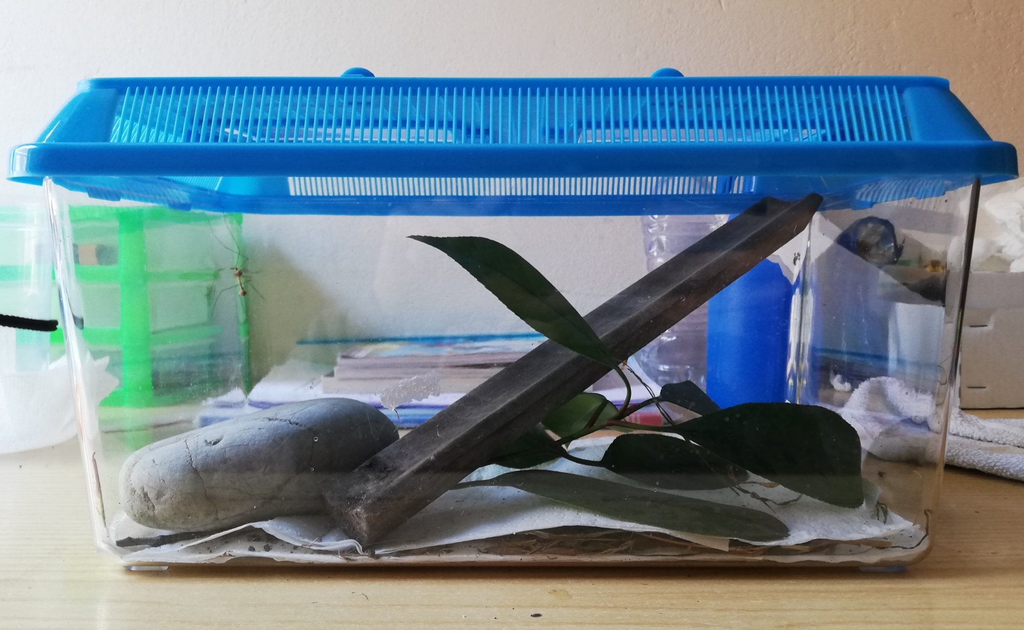 Io ho provato e non ne voleva sapere minimamente! Comunque alla fine le foglie le ho tolte, ho troppa paura che accada qualcosa in fase di muta, finché non è adulta voglio lasciare la teca libera. Continuo però ad aumentare l'umidità sperando che alla prossima muta esca una mantide verde!