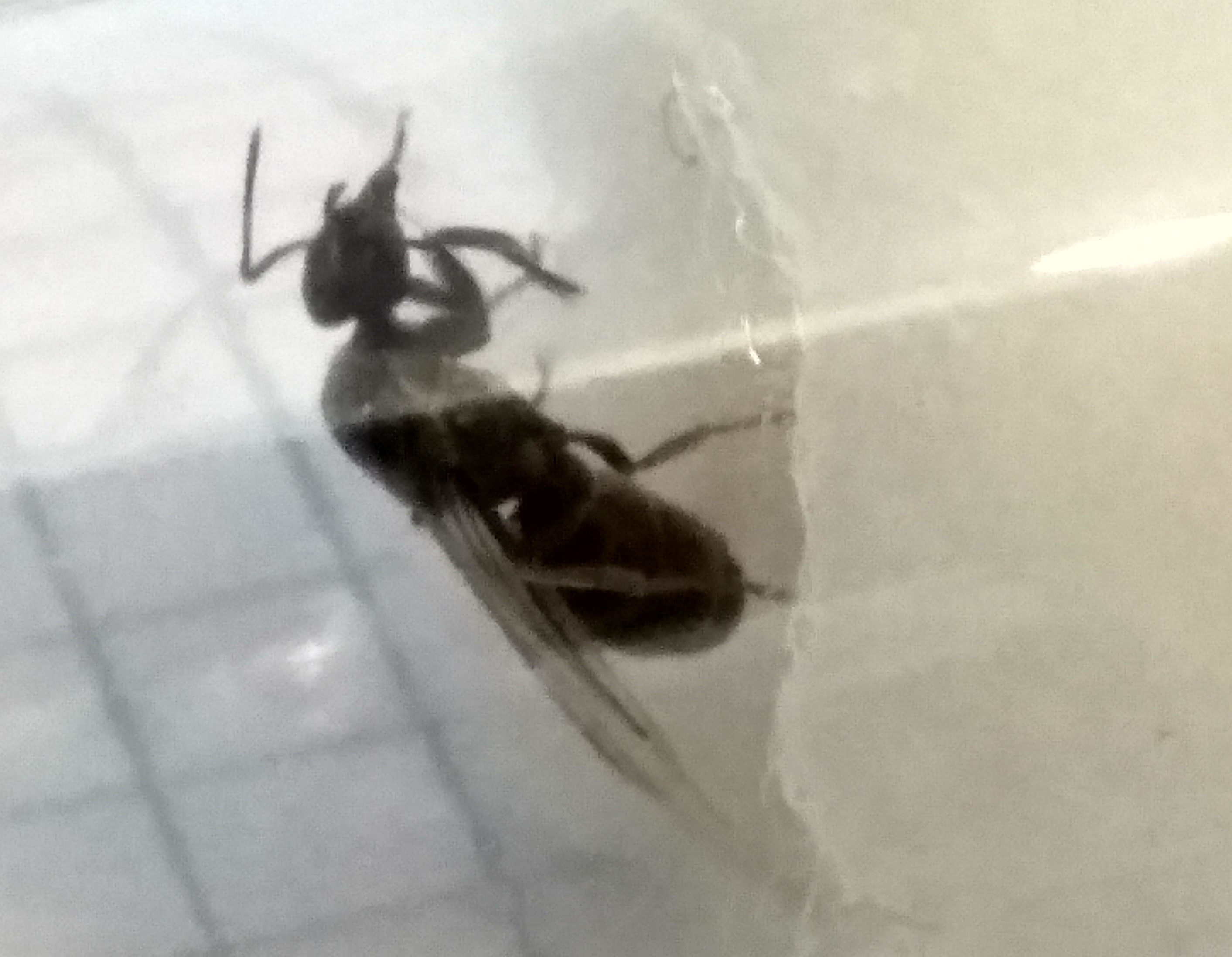 Dato questo comportamento ho pensato che fosse meglio liberarla, forse non era fecondata e cercava ancora di volare via. Quindi l'ho fatta salire su un po' di carta assorbente dove si è scrollata bene le ali ed è andata per la sua strada poco dopo.