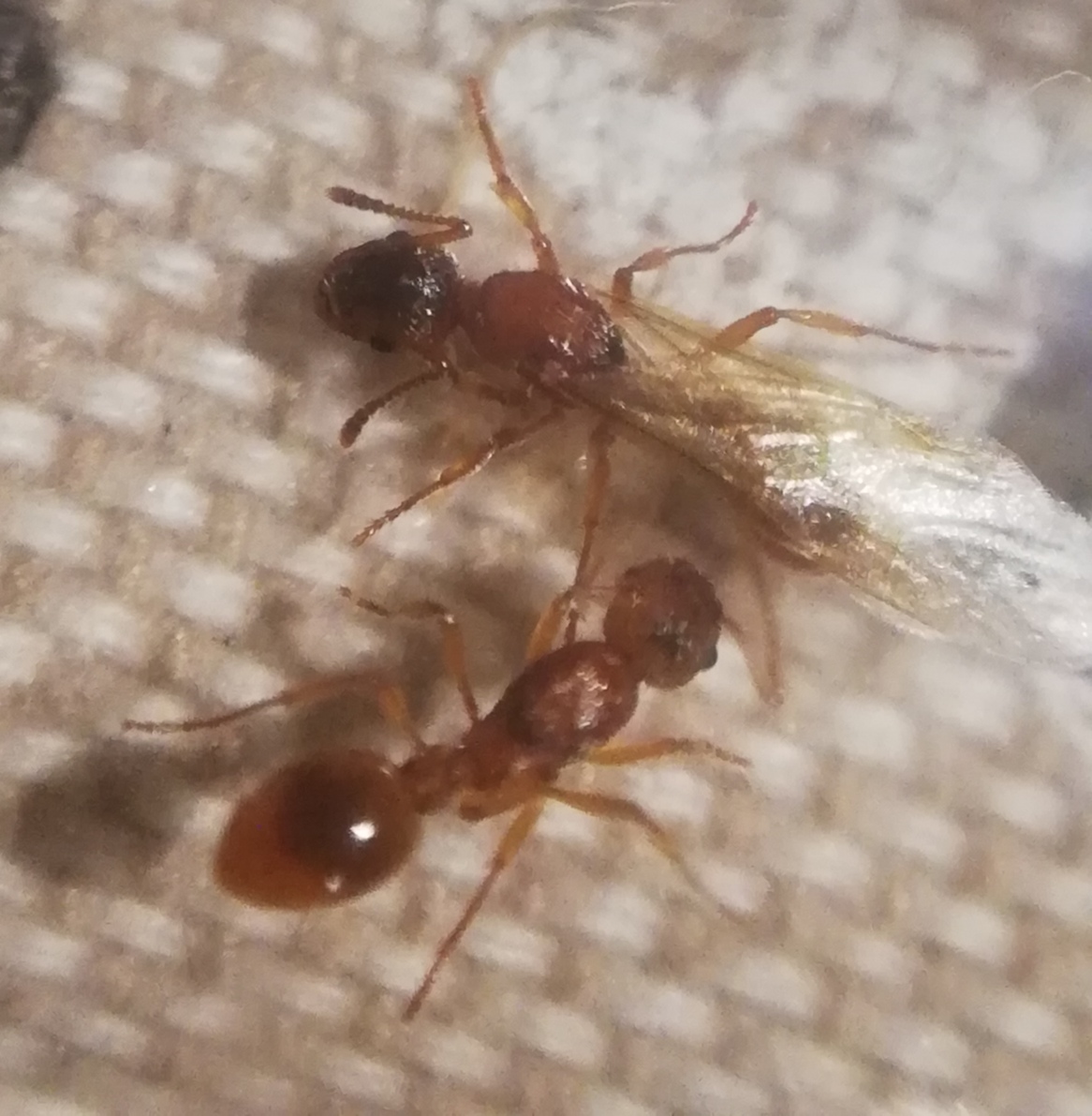 Quella (o quelle) non alata nelle foto si vede abbastanza bene per dire che sia Myrmica rubra. Di quella alata non si vedono gli stessi particolari utili, ma potrebbe anche essere conspecifica. Alcune differenze in dimensioni e colorazione sono normali anche nella stessa specie.