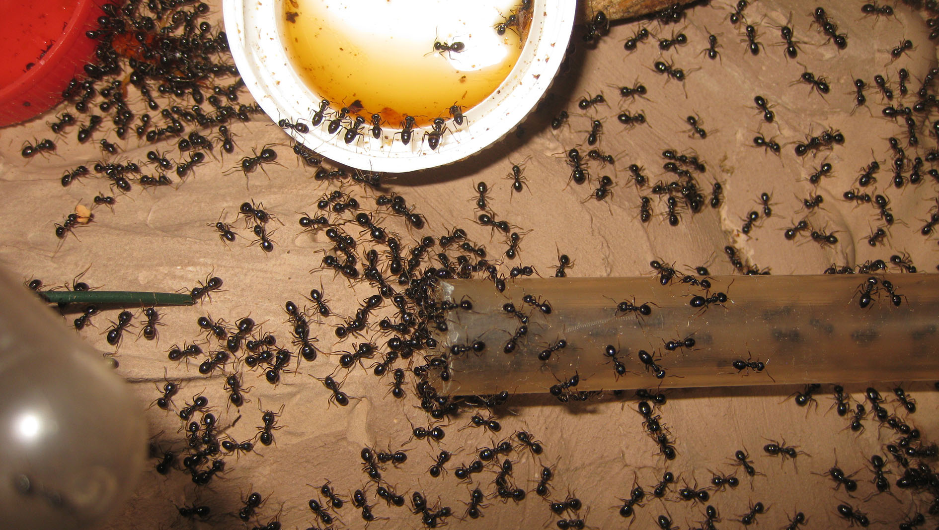 Quanto ai carboidrati, ormai ho rodato per tutte le mie colonie un semplice miscuglio comprendente zucchero bianco, zucchero di canna (70 vs 30%), un cucchiaio di miele e un pizzico di sale. Mescolo bene il tutto con acqua tiepida fino a scioglimento. Lo tengo in frigorifero e ne somministro qb in numerose tazzine in giro per l’arena. Quando le tazzine (tappi di bottiglia o capsule petri) vengono sporcate e riempite, vanno tolte e lavate. Quando il miscuglio non viene ripulito come un piatto di pizzoccheri, va tolto e lavato comunque: meglio dare tazze pulite con mistura nuova, altrimenti le formiche dopo un po' lo schifano e tendono a scartarlo.