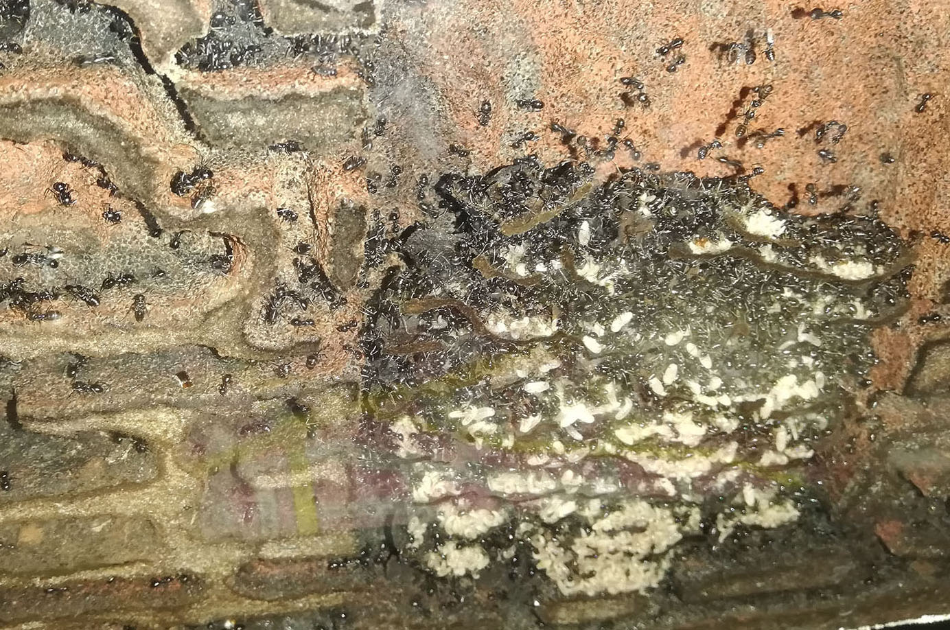 Mi sembrava anche opportuno aggiungere una osservazione nella mia colonia di Lasius emarginatus la cui regina è stata rinvenuta probabilmente nel 2018... quest'anno la colonia è stata trasferita nel primo nido in gasbeton, verso maggio. Il nido è bastato fino ad agosto, mentre ad agosto ormai la colonia era estremamente cresciuta... Ho dovuto forzare anche in malo modo il trasloco dal vecchio nido al nuovo. Una volta traslocata la colonia, ho visto in molti angoli la presenza di un cartone di colore nero. Vedevo spesso mettere, in quell'angolo, pezzi di bozzoli e cotone, nonché anche frammenti di chitina delle prede. All'interno del cartone la struttura era veramente articolata e nascondeva all'occhio la presenza di ulteriori operaie con covata. Nel nuovo nido ho notato che la colonia ha postato lo stesso tipo di detriti all'interno di una camera, e lo spazio non è assolutamente eccessivo... suppongo quindi che il prossimo anno avrò sorprese anche da parte loro!