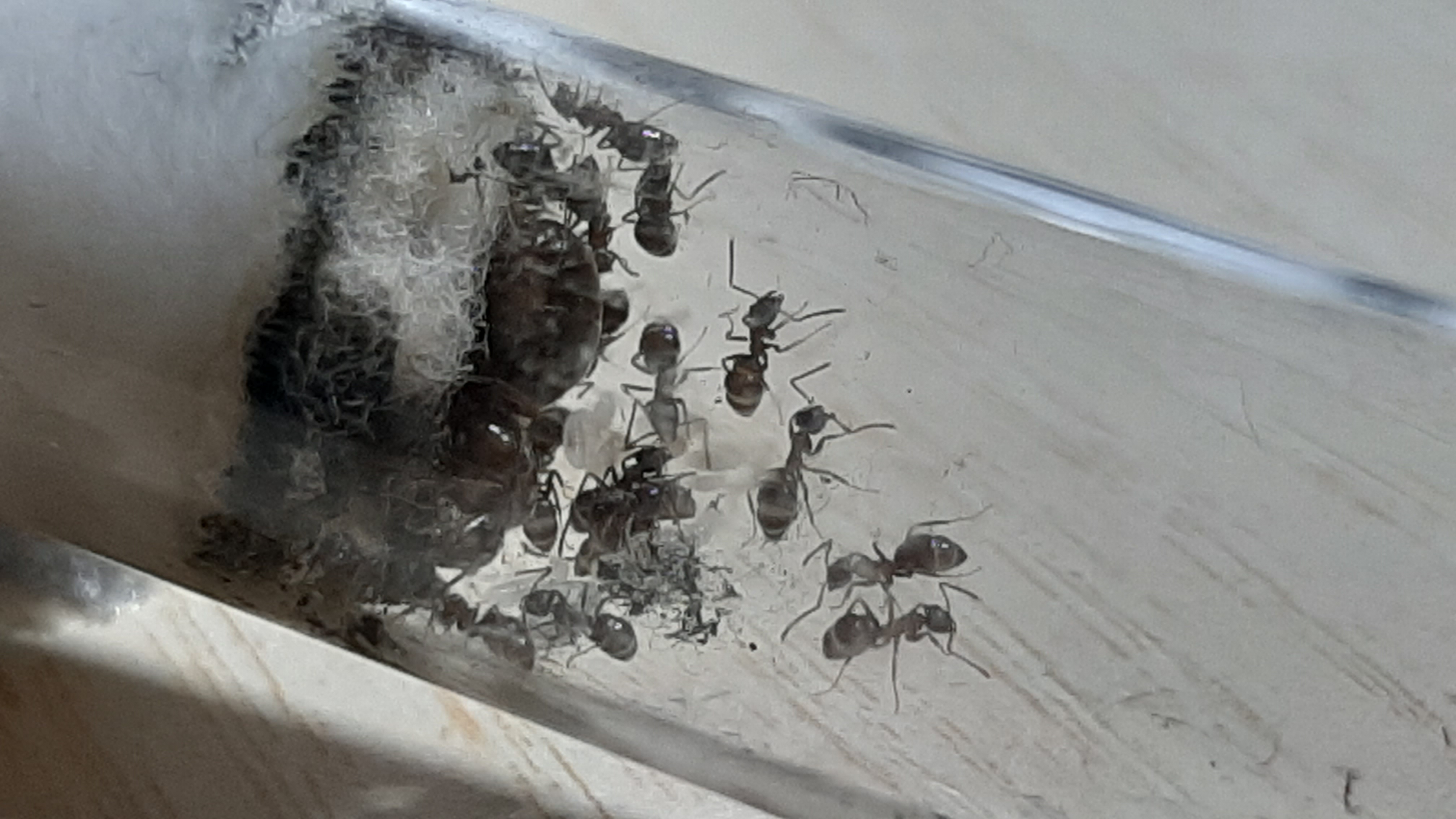 Dopo quindi 2 mesi ancora, oggi, mi ritrovo ancora quella sporcizia nera che macchia il cotone. Se potete notare dalle foto, sta anche un pezzo coprendo alcune larve e questo un po' mi inquieta. La colonia ha piu' di 30 operaie, molte larve pronte alla metamorfosi e una regina in continuo lavoro, ma questo nero mi preoccupa.