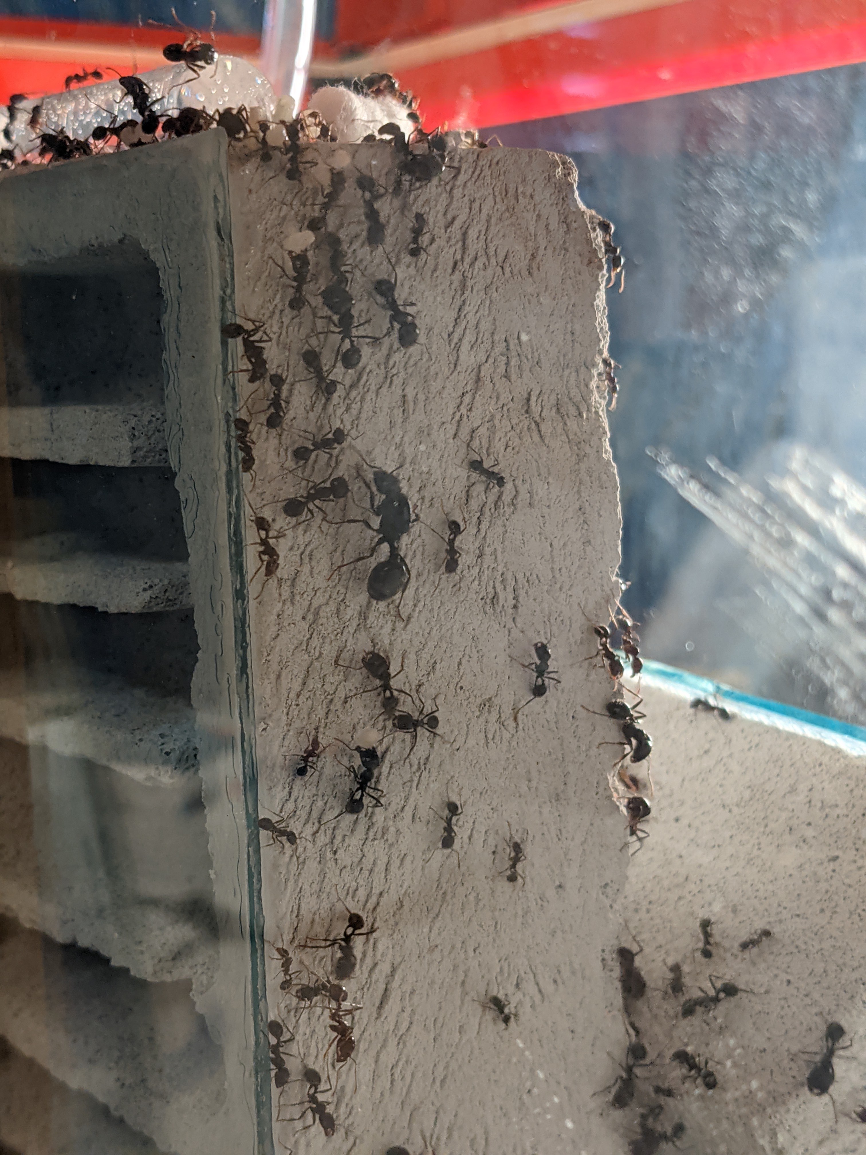 Tra università e impegni vari sono stato davvero poco a casa e quindi non ho molte foto da mostrarvi. Ora però la covata è aumentata sensibilmente e stanno sfarfallando le prime operaie ancora non del tutto pigmentate. Purtroppo le stanze non garantiscono ottima visibilità (soprattutto quelle più basse nella zona bassa del nido) e non sono sicuro se ci sia un sacco di altra covata nascosta sul fondo. Le formiche sono tornate voracissime e mangiano di tutto. Ho problemi a trovare insetti freschi ma apprezzano anche prosciutto e uova. Hanno allungato le zampe anche su qualche pezzo di frutta.
