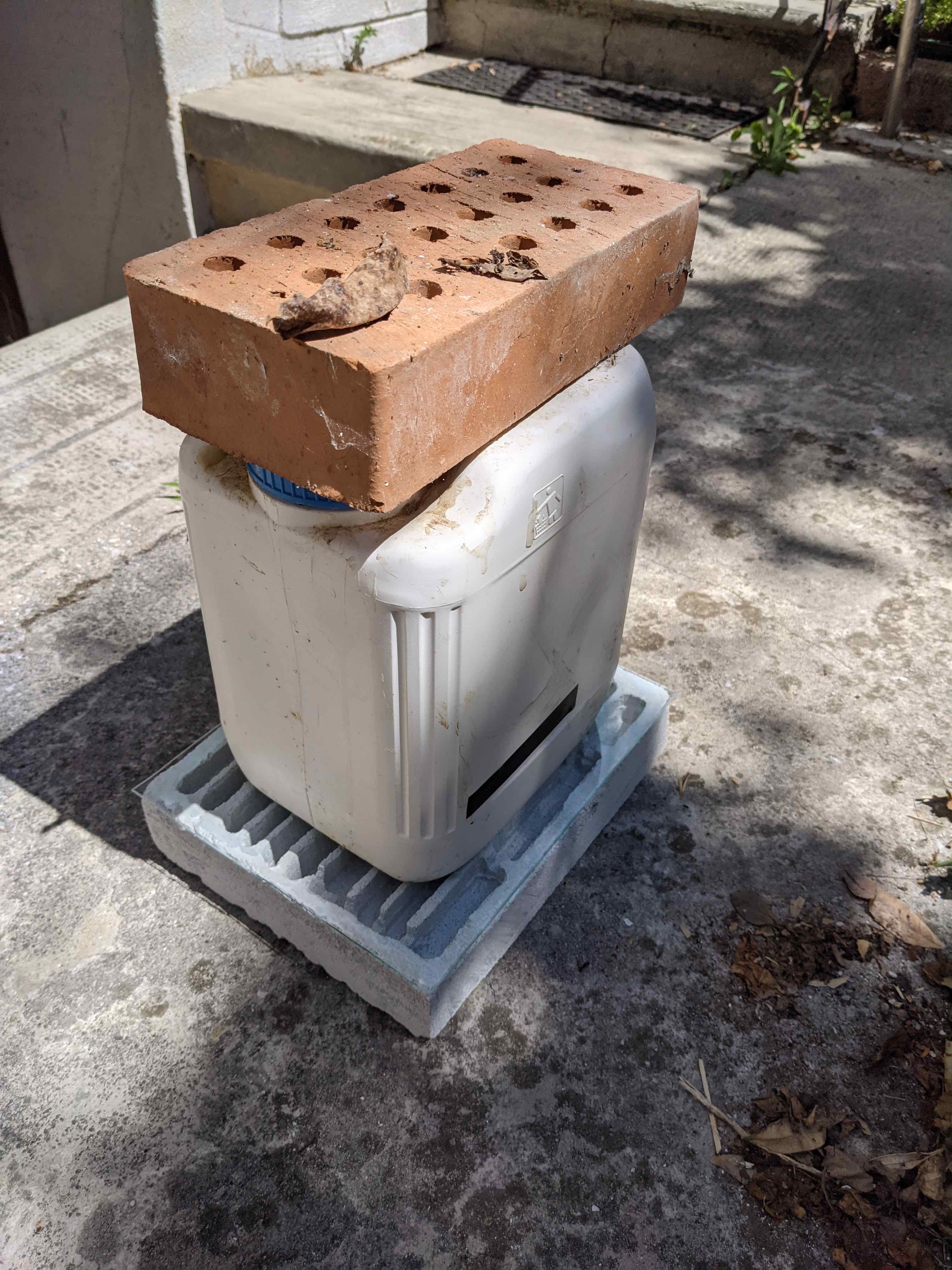 Allego anche una foto del setup corrente. Il nido ha quella scanalatura dove fornisco acqua, mentre il filo nero ha un suo corrispettivo rosso dall'altra parte del nido: un buco attraversa il nido al di sotto delle camere abitate e ha dentro delle resistenze, che accese riscaldano una parte del nido. Normalmente sul nido ho un "coperchio" fatto con la stampante 3D per tenerle al buio, in questo momento ci ho messo sopra anche un pezzo di cartone in modo che quando sono in battuta diretta di sole non si scaldino troppo. Vicino il vecchio nido, che presto verrà collegato.