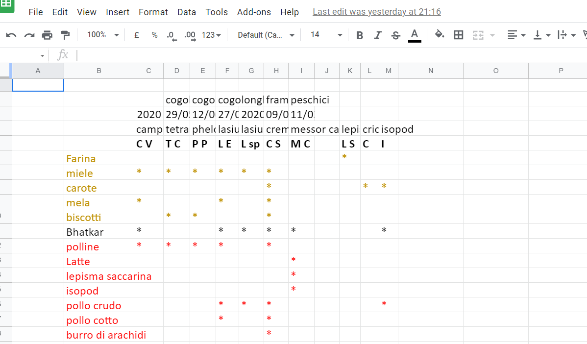 Cosi ho iniziato a fare una tabella con cibi e colonie per identificare chi mangia cosa