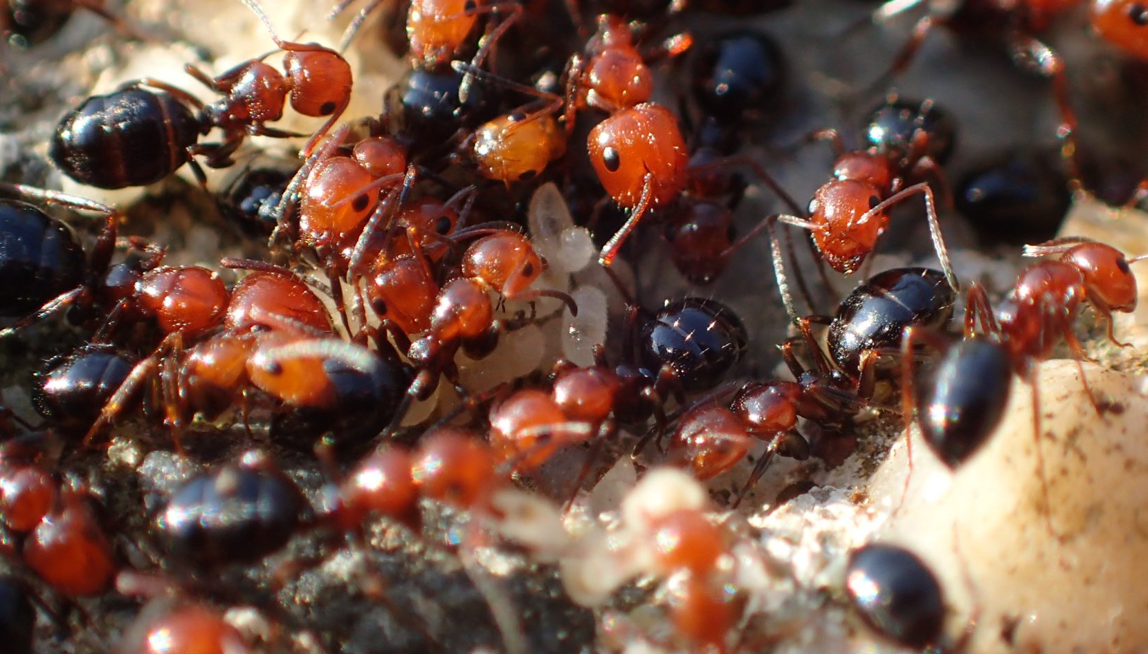 Oggi, Castelleone (CR), sotto una pietra in una vecchia discarica ormai "naturalizzata"; mi sembrano delle rizzaculo (un pochino più panciute del solito, non vedo neanche le spine che di solito hanno sul propodeo...) ma quelle che ho a casa, a differenza di queste, hanno il torace nero e mi sembrano tutte delle stesse dimensioni (qui, regina a parte, ci sono formiche molto più grandi di altre).