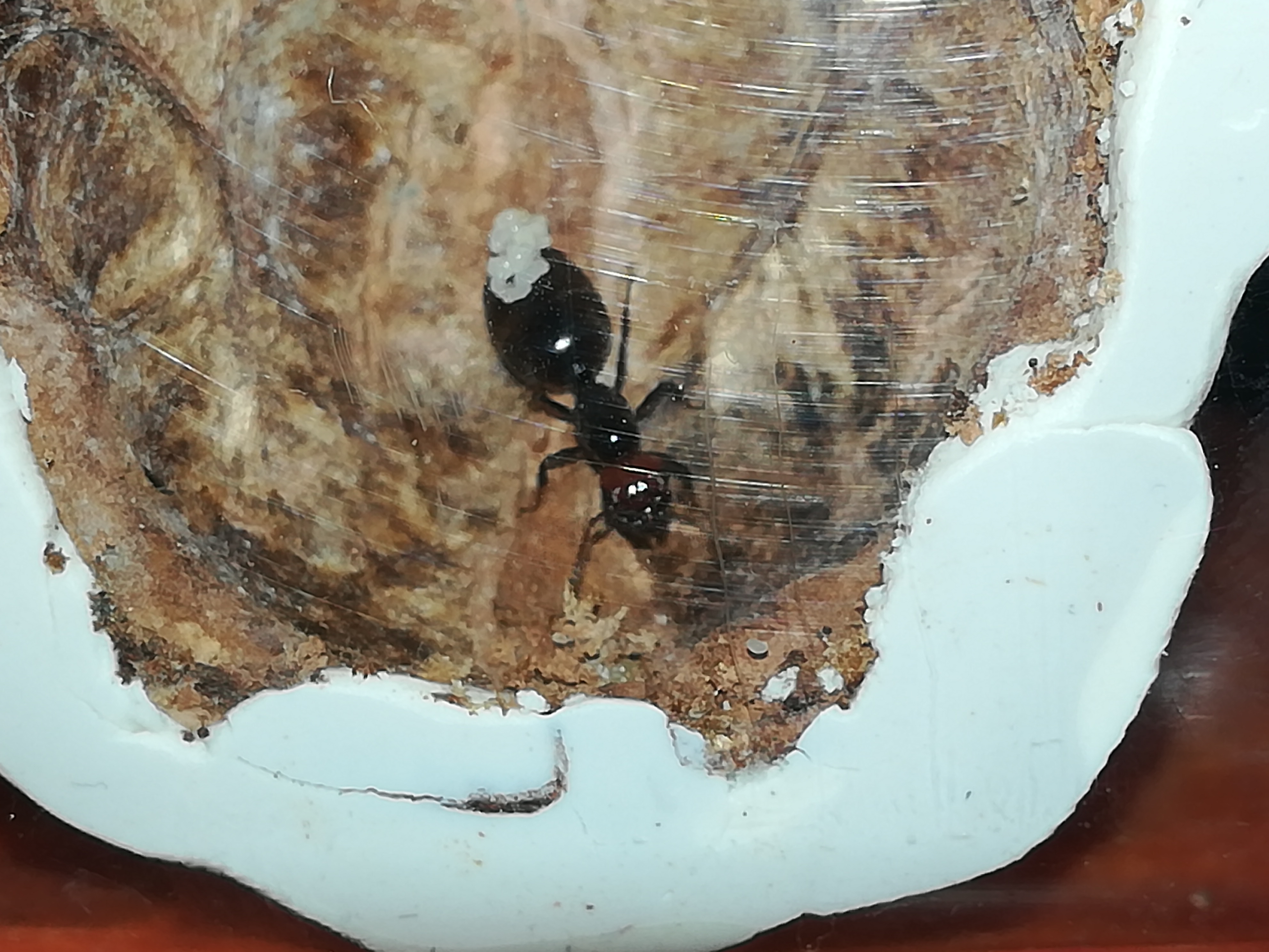 Continua ad essere agitata e preferisce la zona più asciutta, è evidente che nella provetta o nel luogo dove la tengo non si sente a suo agio. Ho deciso di provare a farla fondare in un mezzo guscio di noce, incollato alla parete di una mini arena con del pongo, dovrebbe essere atossico e di facile rimozione in caso di problemi. L’ingresso al claustro è stato fatto con una punta per legno 8 mm ed è tenuto chiuso con un piccola provetta di plastica per l’acqua e l'umidità. Nella noce ho aggiunto 3 granelli di zucchero e un moscerino morto. Gli ho permesso di fare un giro in arena prima che entrasse nella noce, sembra che la noce gli piaccia. Sembrerebbe inoltre che durante l'uscita in arena abbia evitato il pongo, cosa da approfondire.