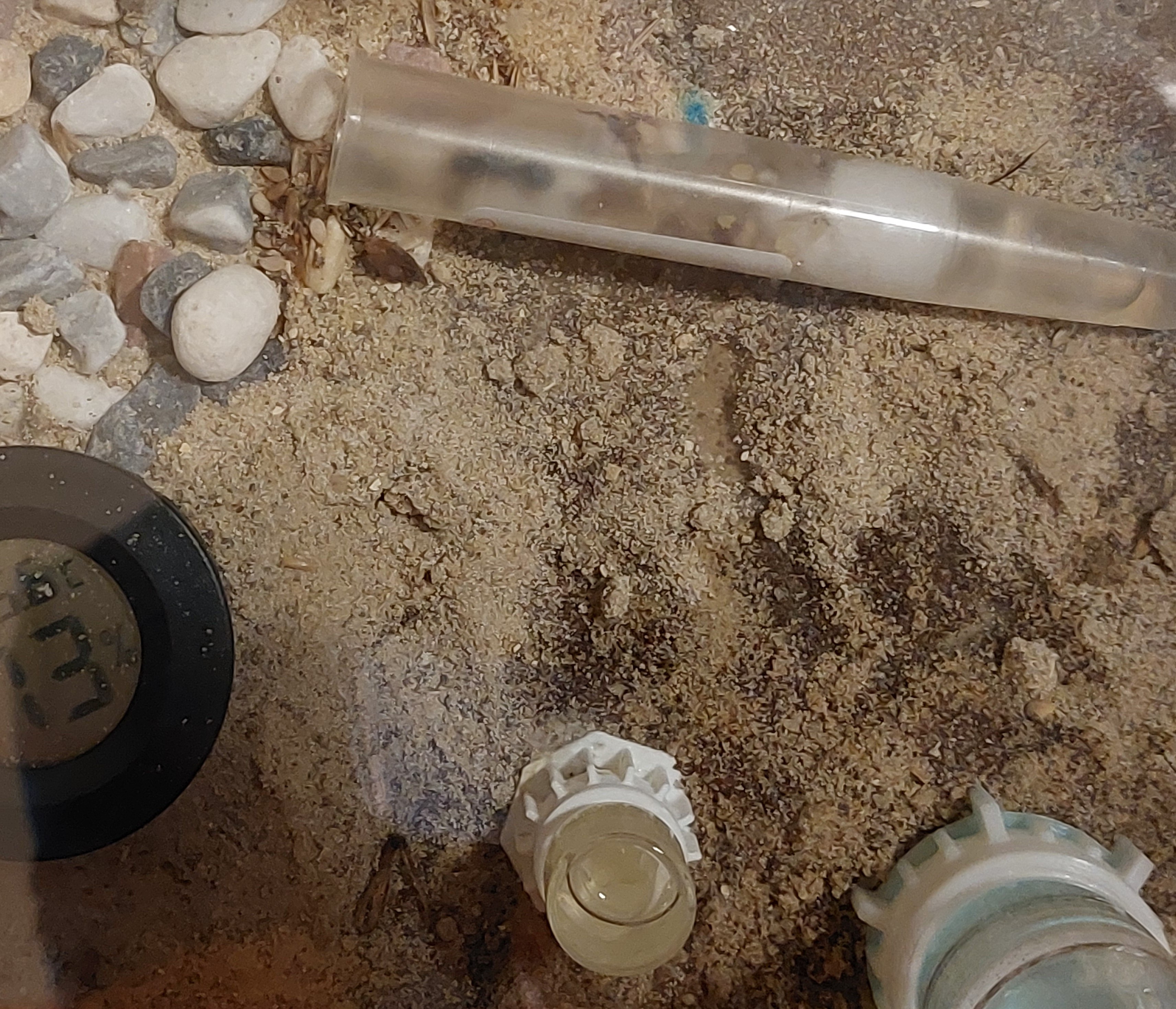 Con l'aumento della temperatura nella stanza ed il normale utilizzo l'acqua disponibile all'interno della fiala è terminata Ho provveduto ad inserire una nuova provetta con nuovo cibo ed acqua ma le formiche continuano a preferire la vecchia casa. Molti esemplari sono morti è rimasta la regina con due formiche.