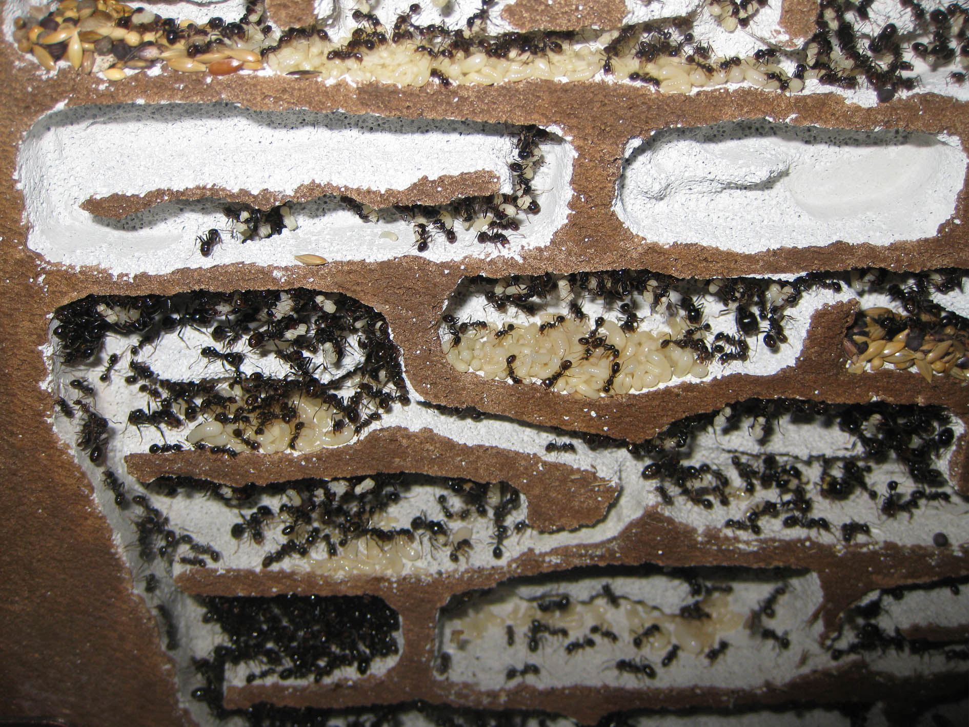 Però per le mie esperienze questa colonia mantiene sempre una certa quantità di semi anche dopo l'inverno, semi che non so se in realtà mangerebbero, perché io ne sto dando di nuovi e quelli vecchi sono andati perduti nel trasloco (ma meglio così partiamo da zero). In ogni caso hanno raccolto subito i semi freschi, e per ora ce ne sono un paio di cucchiai stipati. Inoltre hanno già mangiato 2 grilli e 2 camole.