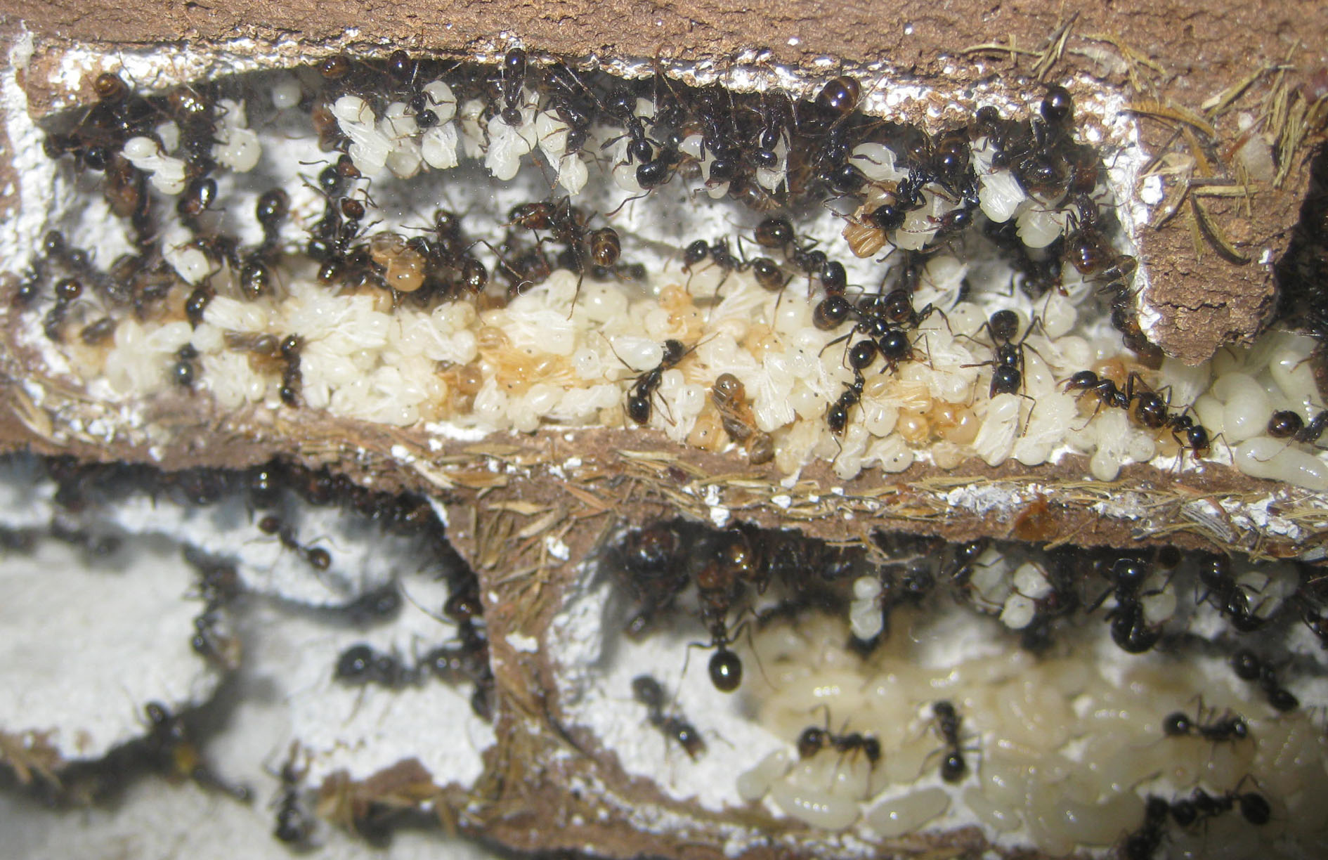 Dopo una primavera stentata, in cui sembrava che le pupe non arrivassero vive alla fase di pigmentazione (venivano espulse dal nido e abbandonate), finalmente nuove generazioni di operaie stanno arricchendo la colonia.
