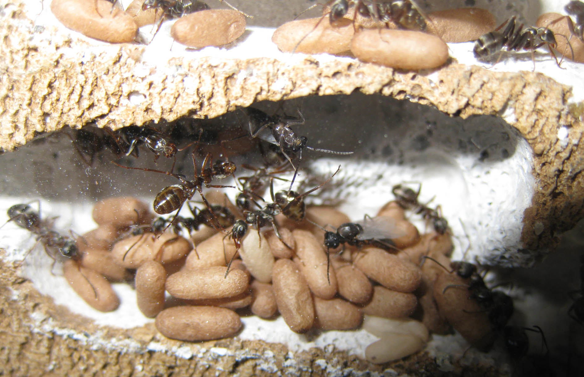 La colonia è stata tenuta abbastanza vicina a una fonte di calore durante il giorno, per tutti gli ultimi 15-20 giorni. Questo può aver velocizzato la fase uovo-larva e sucessivamente larva-bozzolo. Vediamo quanto ci metterà nelle medesime condizioni a sfarfallare la prima operaia. Tremo già nell'attesa, soprattutto perché la mega-colonia di Formica cunicolaria non sta sfornando bozzoli di operaie, ma per ora solo di alati.