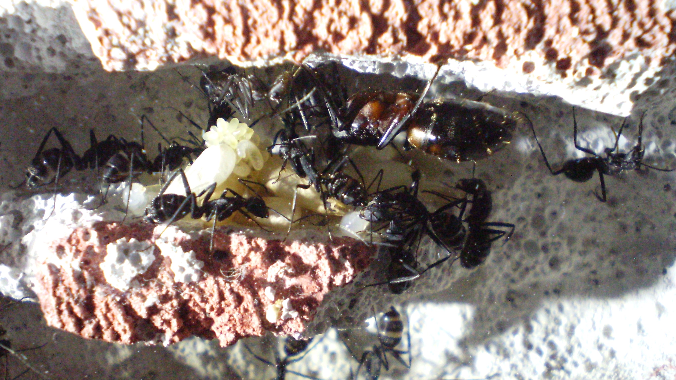 La cosa interessante è che le ultime nate di taglia leggermente maggiore hanno deciso appena pigmentate di uccidere tutte le operaie adottate di Camponotus nyladeri che tanto si erano date da fare per aiutare la regina, la cosa mi ha un po stupito dato che l'odore probabilmente dopo un'anno di convivenza dovrebbe essere lo stesso delle sorelle , che sia entrato in gioco un componente nuovo ? forse visivo ? le nuove operaie sono quelle che cacciano all'aperto e sono notevolmente più combattive delle prime .