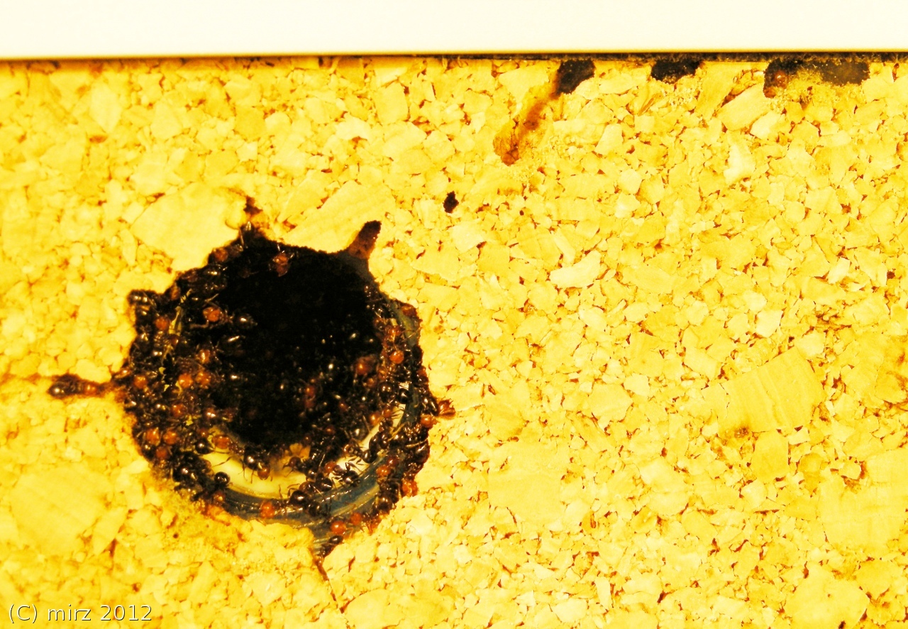 1 - Da un piccolo oblò si scorge qualcosa che si muove; è una piccola operaia che mordicchia il sughero e sembra dire: «Che ti guardi? Qui si lavora e tu ti trastulli!». Le "minatrici" hanno scavato, dalla camera di areazione (1), una galleria a cielo chiuso di oltre un centimetro che si apre su una finestra (2) di circa 3x4mm.