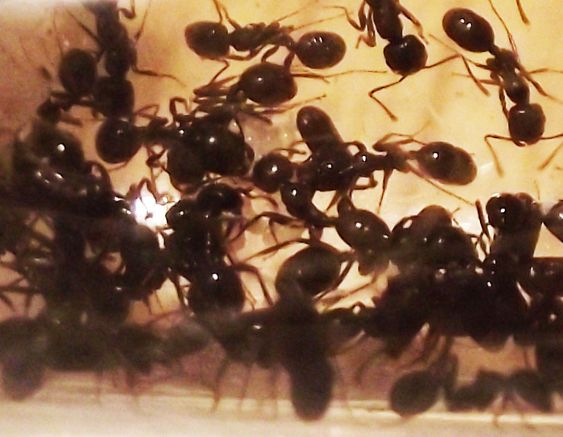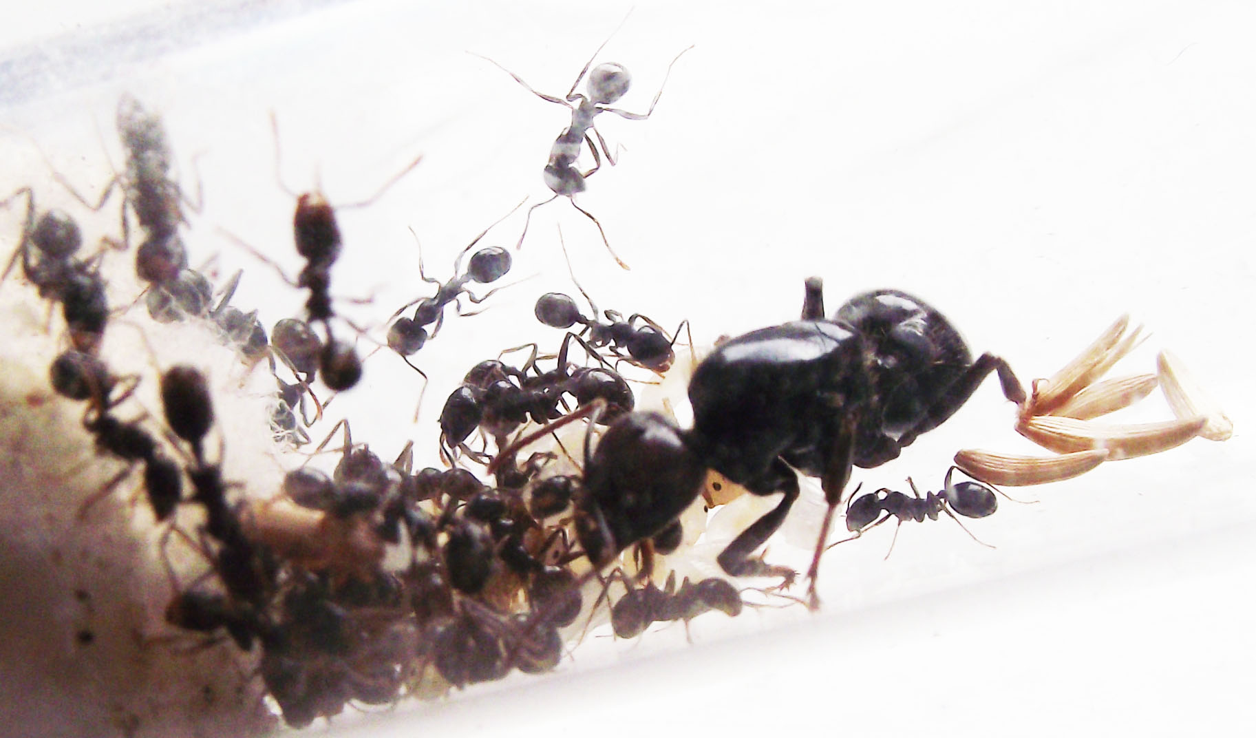 La colonia continua a crescere e inizia ad avere più necessità di proteine, fornisco loro ogni 2 giorni insetti più grandi e loro li smontano li portano in provetta e poi accumulano tutto in un'angolo dell'arena dove mettono gli scarti, sono sempre più numerose le operaie minor con la testa più grande delle altre prime nate ma non noto nessuna media, vorrei capire quale fattore le porta a far nascere delle medie, un maggior numero di operaie, più proteine a disposizione, molti semi grandi, non saprei, comunque ora superano le 30 operaie e tutto il giorno 5 o 6 sono in arena, la sera tutte rientrano nella provetta.