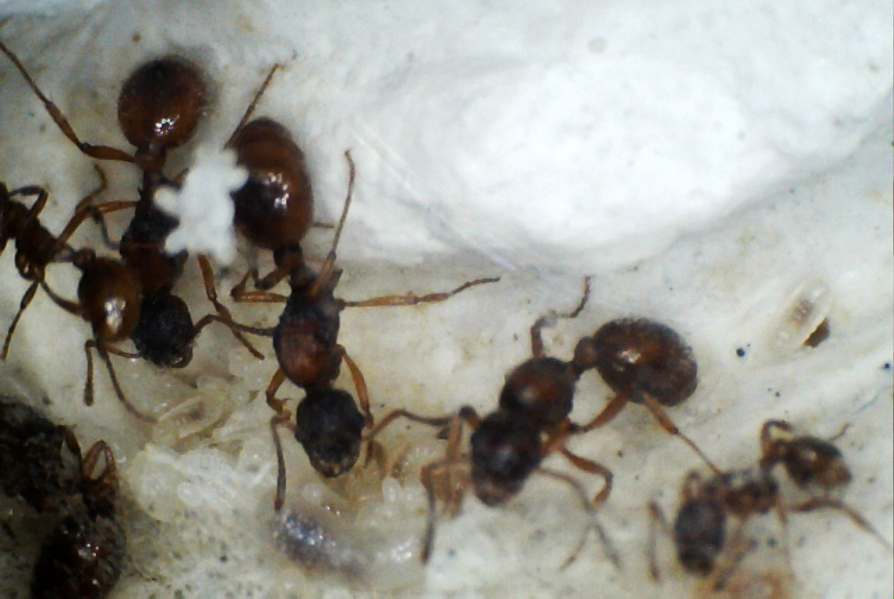 La piccola colonia cresce ma molto lentamente ed è molto poco attiva, qualche uovo una quindicina di larve e due pupe, le operaie sono una sedici ma non curano molto la pulizia della provetta ed è cosi sporca che è difficile contarle bene. Non essendo cosi attive non ho avuto ancora la necessità di aprire la provetta in una arena. Ma prevedo con la nascita delle prossime larve che si raddoppi il numero della colonia. Con la loro inattività noto anche un consumo minore di cibo.