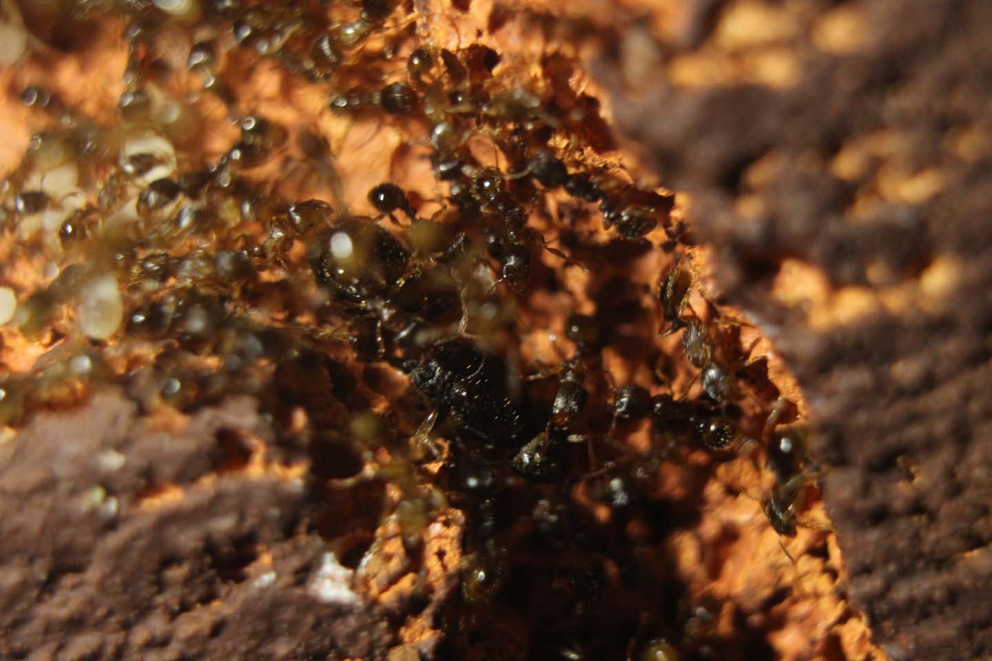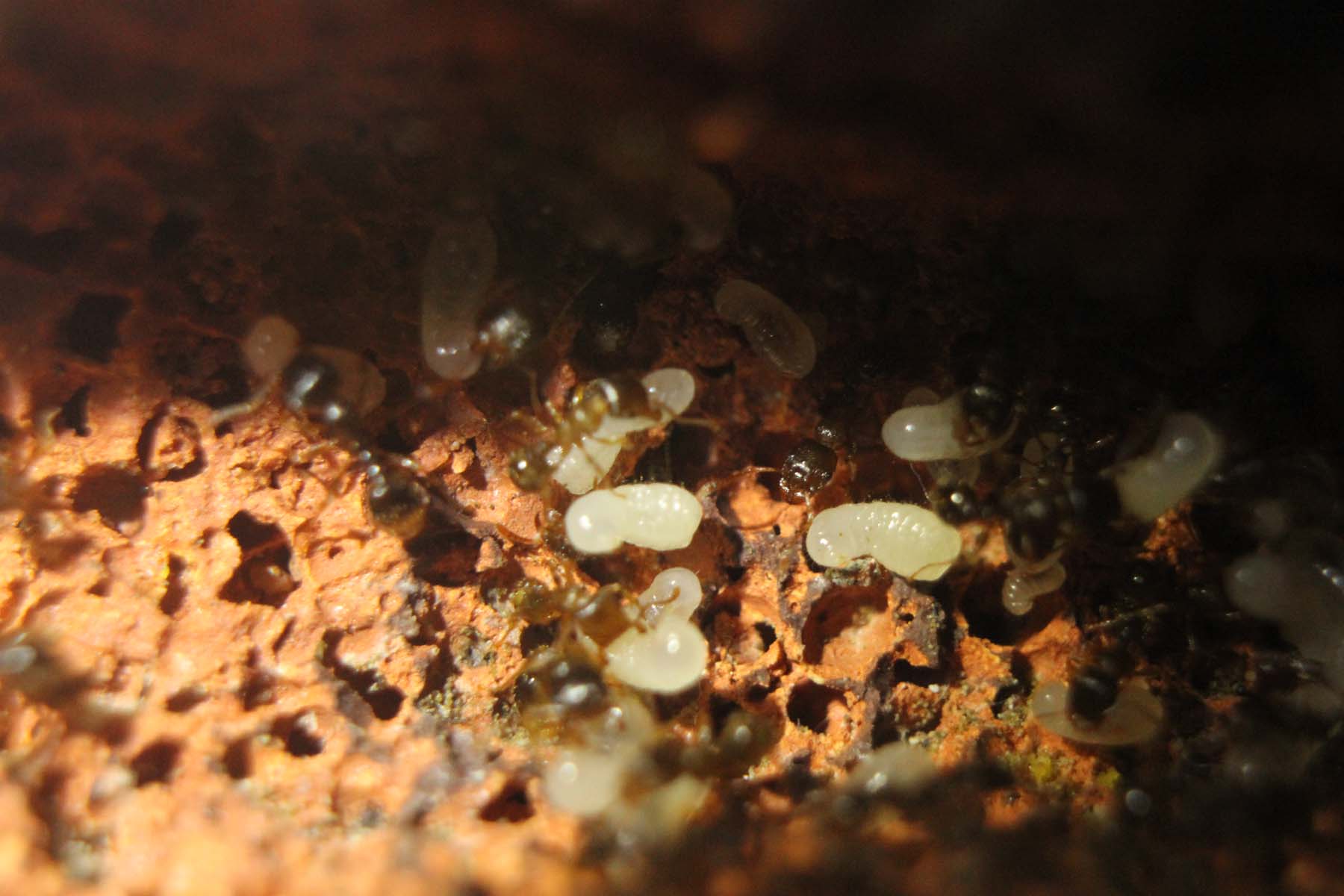E per chi avesse ancora dubbi e paure sull'usare gasbeton con queste specie piccole a causa del presunto rischio per le operaie di perdere uova e larve, ecco la prova che è un rischio infondato e paure altrettanto infondate...infatti, osservando queste macro, è palese che le specie piccole non hanno alcuna difficoltà a trovare uova e larve tra i fori del gasbeton.