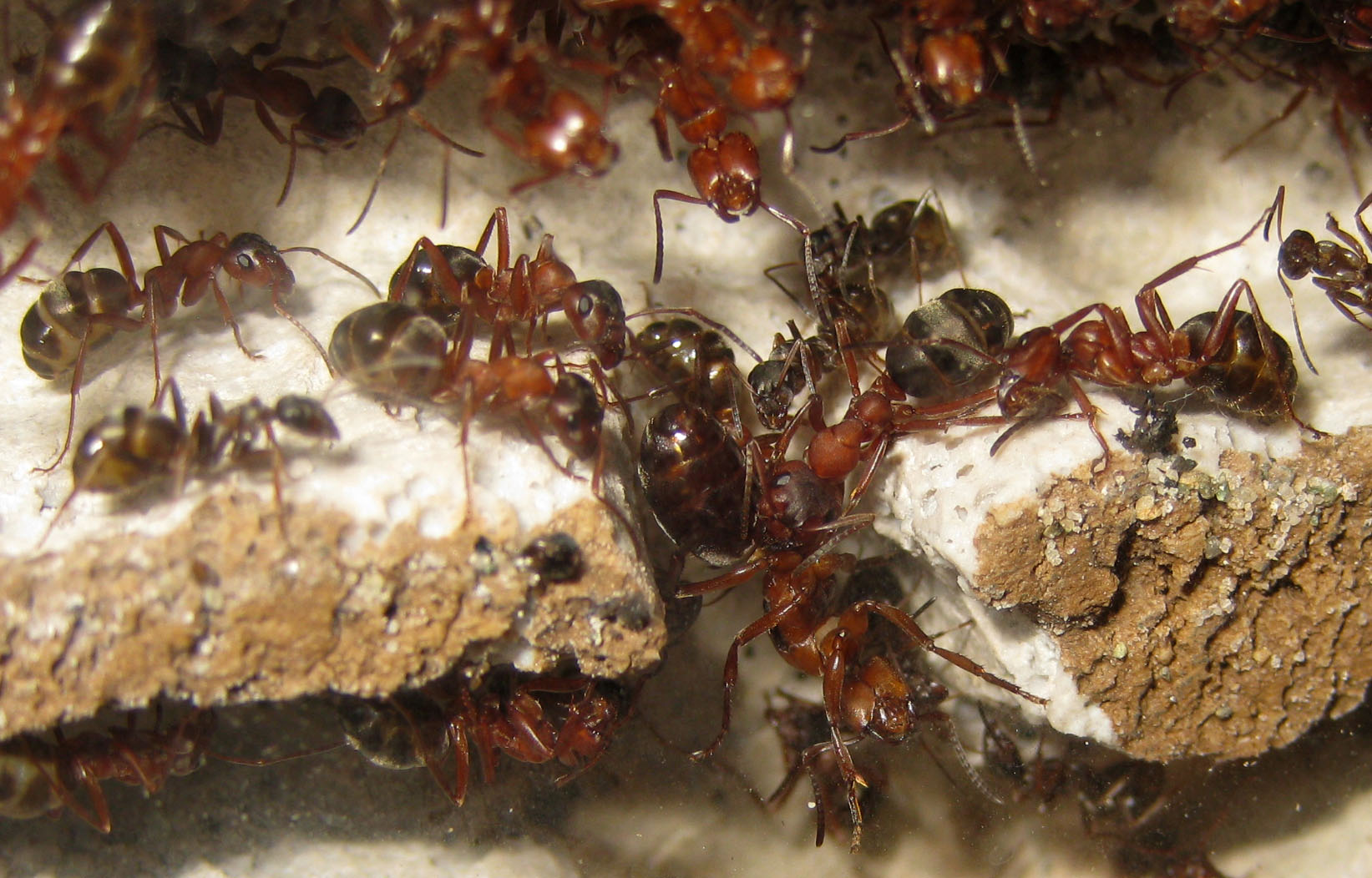 Molte operaie di entrambe le specie hanno il gastro gonfio, dovuto anche ad alcuni rifornimenti dati nell'ultimo mese, che sembra le formiche abbiano gradito.