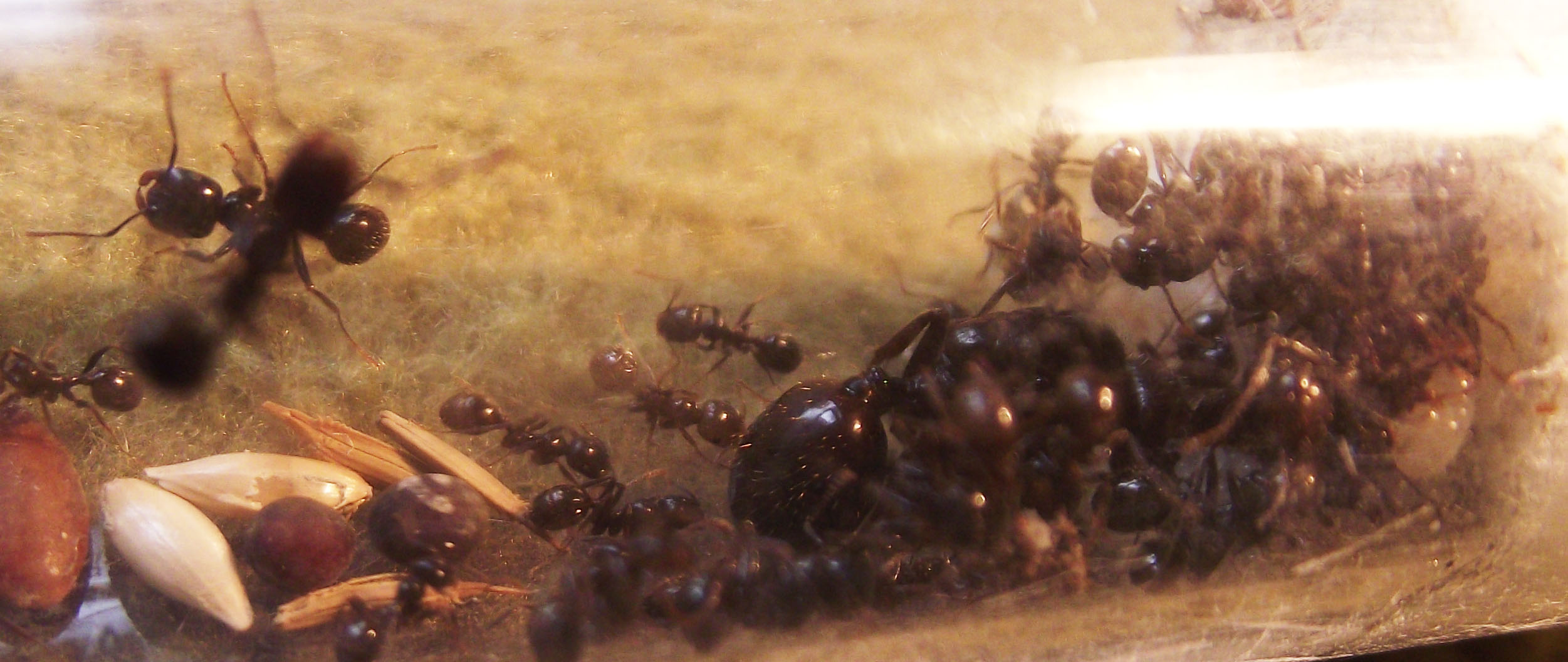 Come previsto ormai anche se all'esterno fa freddo in casa è abbastanza caldo da far risvegliare la colonia, le larve si sono impupate e mi sembra di poter dire che hanno nutrito abbastanza una larva per avere di nuovo una media nella colonia. Non accettano proteine per ora, ne camole ne pezzetti di carne, purtroppo non ci sono altri insetti per ora...Appena possibile provo con un pò di tuorlo d'uovo vedo se lo gradiscono. Non essendoci medie o major non riescono ad aprire i semi, la regina ormai non si occupa più di questo come faceva l'anno scorso, ho notato che non avevano "pane" e i semi rimanevano intatti e sempre dello stesso numero, ho provato a fornire un seme schiacciato, è stato subito portato dentro e lavorato, fino alla nascita della prossima operaia con un capo abbastanza grosso penso che dovrò aiutarle un poco, nei mix di semi non c'è una grande varietà in natura troverebbero sicuramente piccoli semi adatti a loro.