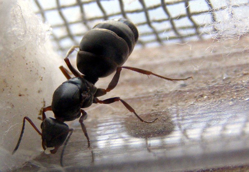 Avendola trovata in cortile, sono sicuro che nè io nè la mia famiglia abbiamo distrutto formicai, nella foto sotto un particolare, che ad occhio non la fa assomigliare ad un Camponotus, mi pare, e di sicuro non è un Lasius, anche se come dimensioni è solo un paio di mm più lunga di una regina di Lasius gr. niger