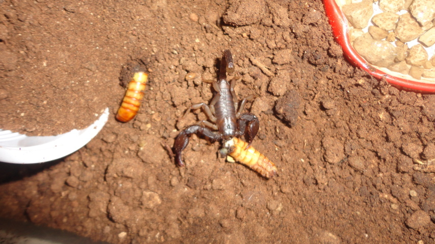 Nuove foto mentre lo scorpione sta "succhiando" l'interno di una camola tagliata a metà.Doveva avere veramente molta fame dopo questa muta,la ha mangiata per 3 ore buone e la mattina dopo lo ho trovato che ancora la aveva tra le chele