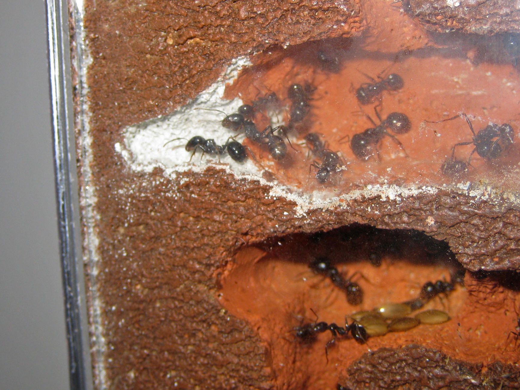 La colonia ora è bene sistemata: ci sono grandissime quantità di larve appena schiuse, e ancora ampi spazi vivibili. Le formiche sono incalcolabili come al solito, si può solo fare una stima approssimativa di qualche migliaio, ma il fatto che stiano volentieri appese ai soffitti, e il polimorfismo della specie, rendono i calcoli difficili, e ormai ho rinunciato a fare valutazioni accurate. La mia intenzione è di dare alla colonia un paio di mesi di stop al culmine dell'inverno, a seconda di come si svilupperà la covata odierna, per non danneggiarla.