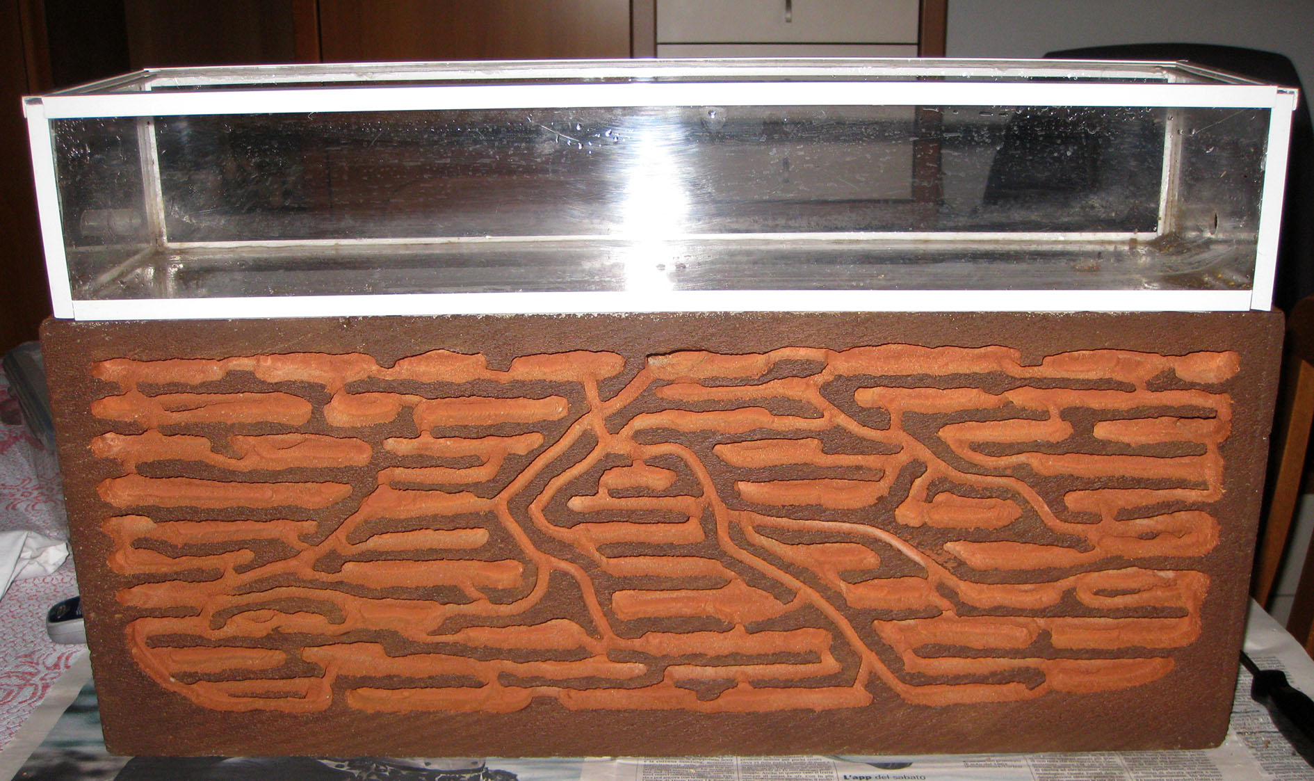 Ho forzato il più possibile il trasferimento spontaneo, spostando la struttura in una contenitore e iniziando a riempire lo spazio con acqua fredda. Man mano che il livello si alzava (due giorni di tempo) le recalcitranti si spostavano sempre più in alto, verso il passaggio con il nido nuovo, ma nonostante questo, ancor oggi giorno era evidente che nonostante il disagio del freddo e dell'umidità crescente, le truppe di retroguardia non ne volevano sapere. Le formiche non si spostavano nemmeno in presenza dell'acqua che invadeva le stanze, rifugiandosi sui soffitti piuttosto che andare nelle camere dell'ultimo piano.