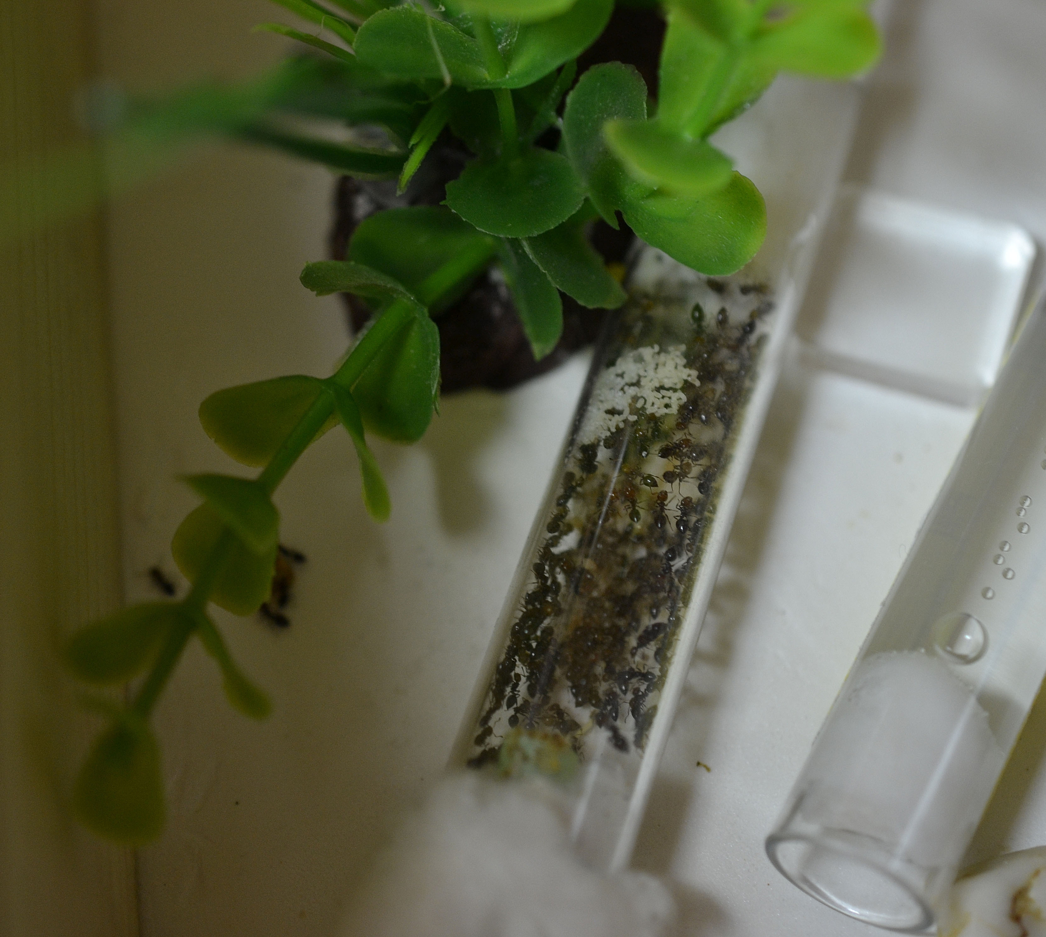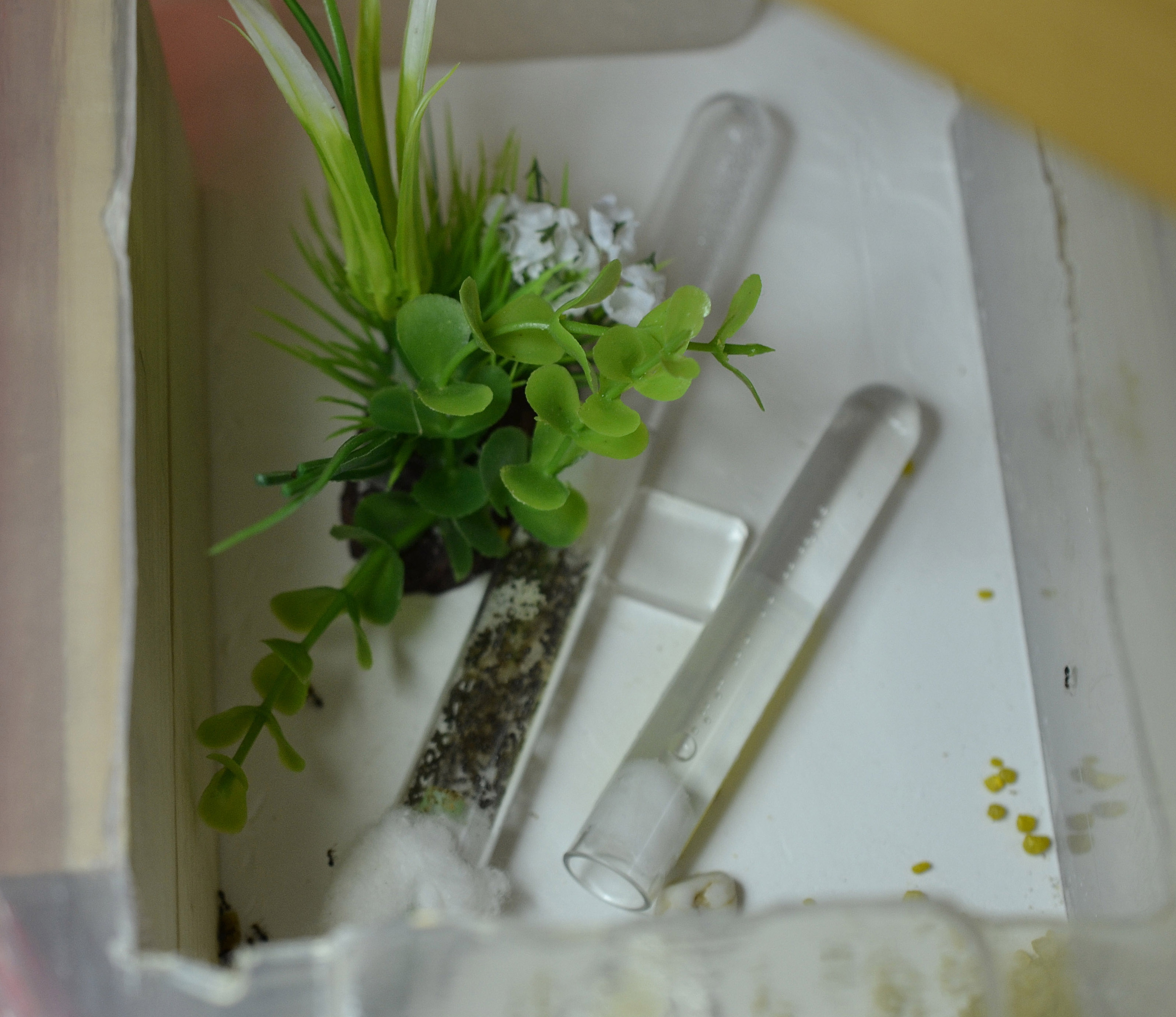 Innanzitutto ho spostato la provetta contenente la colonia nella nuova arena (dove ho inserito il formicaio in legno).