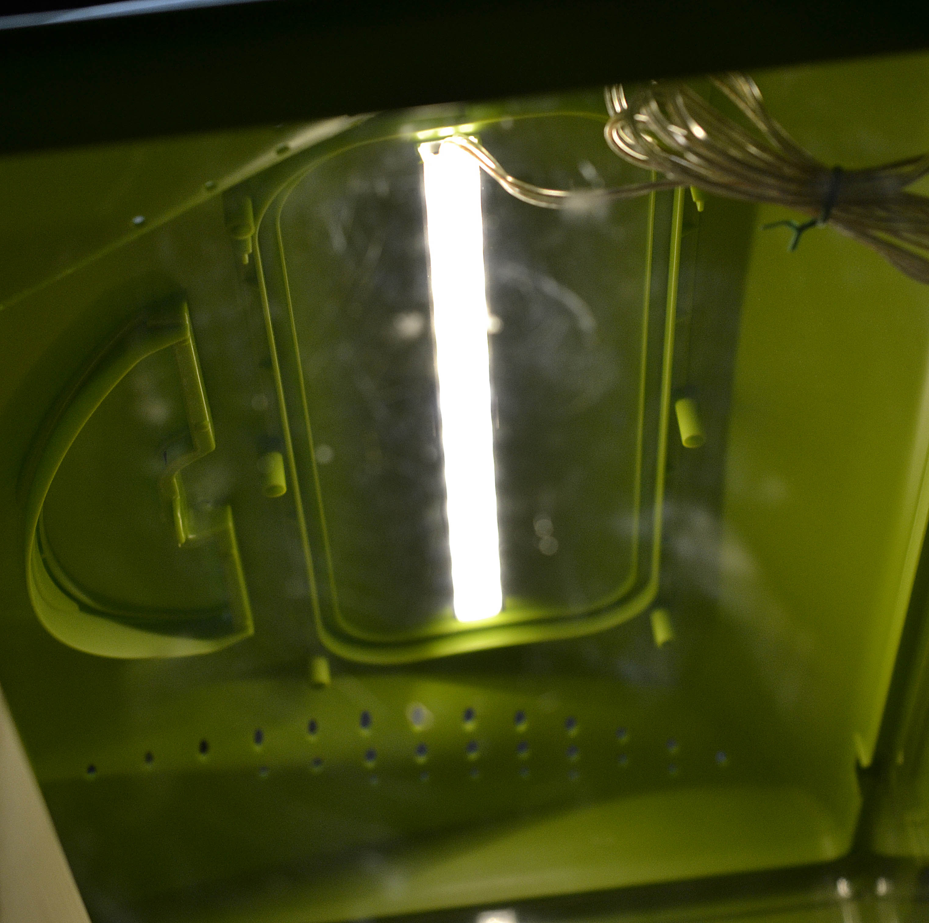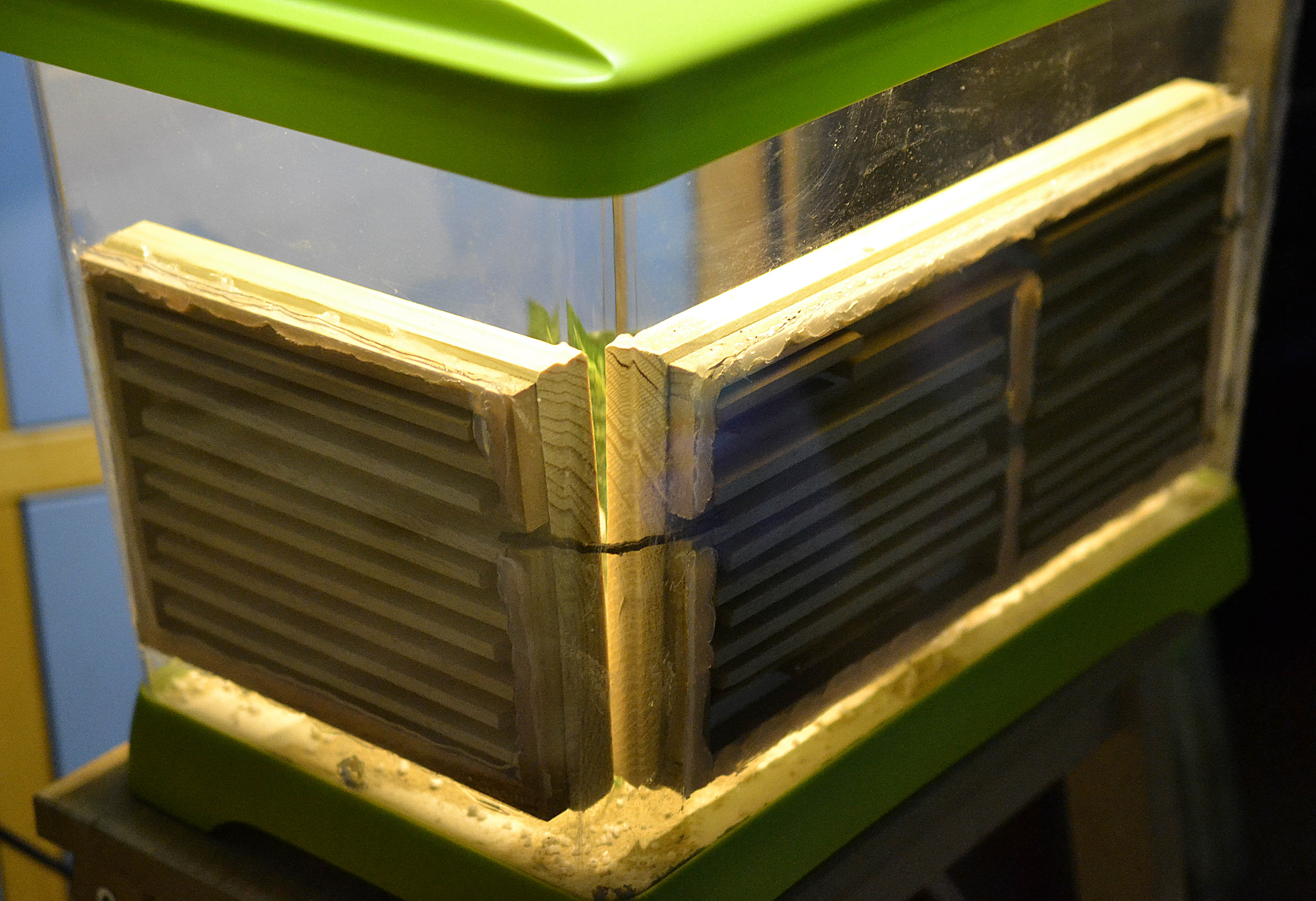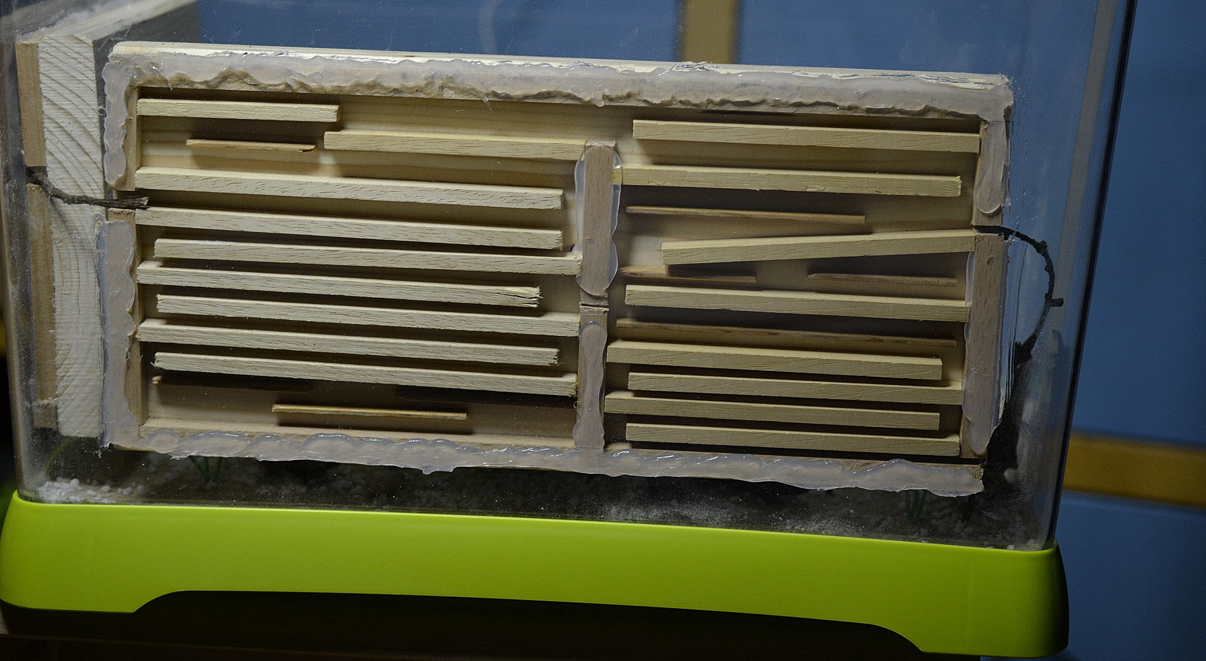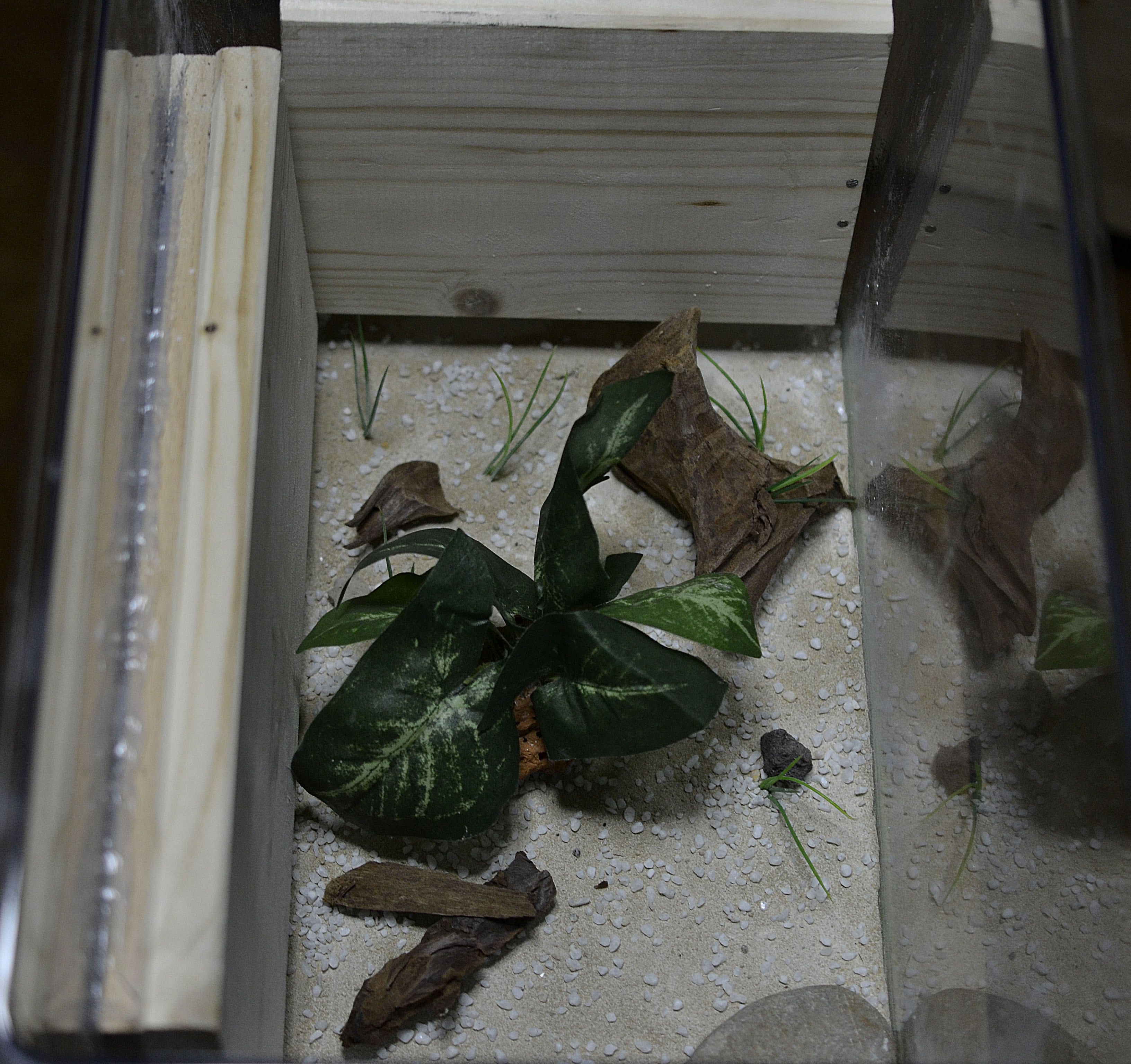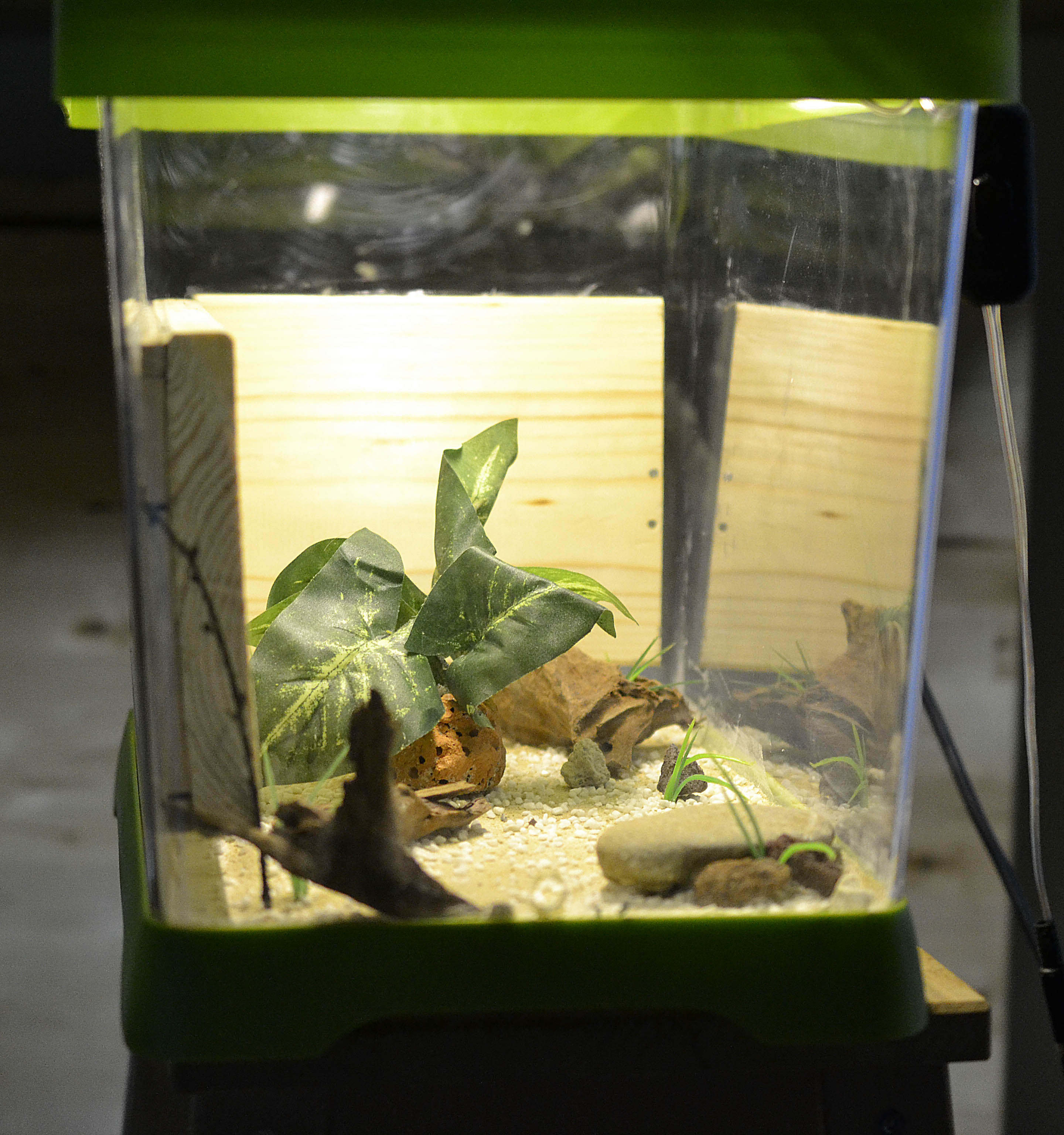 Questa volta, siccome ho utilizzato un acquario in plexiglas rigido, ho applicato i nidi tramite silicone acetico (lasciandolo asciugare per circa 10 giorni). Ho aggiunto il solito substrato sottile di gesso e ho deciso di applicare una piccola striscia di LED (a luce tenue) sul tetto del contenitore. In questa maniera spero (oltre che migliorare l'estetica generale