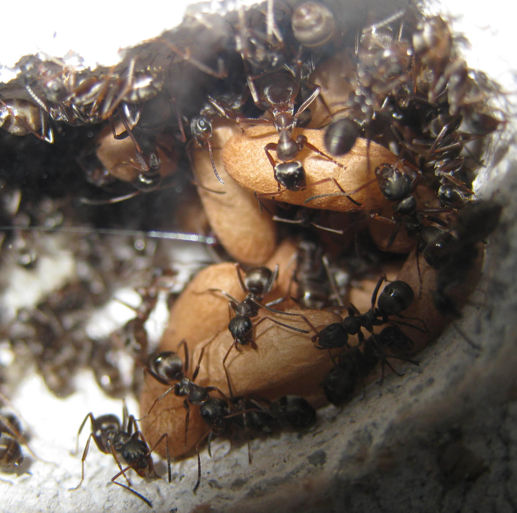 Tutto il Genere Formica continua a riservare sorprese; la regina intanto sta deponendo a mitraglia, ci sono centinaia di uova e tantissimi bozzoli di operaia, inoltre ho registrato un fatto che altre specie non avevano ancora testimoniato: sarà pure che producono un sacco di rifiuti non mangiando i resti dei bozzoli, ma ne producono pochissimi in altro senso perché mangiano cose che altre formiche escludono!