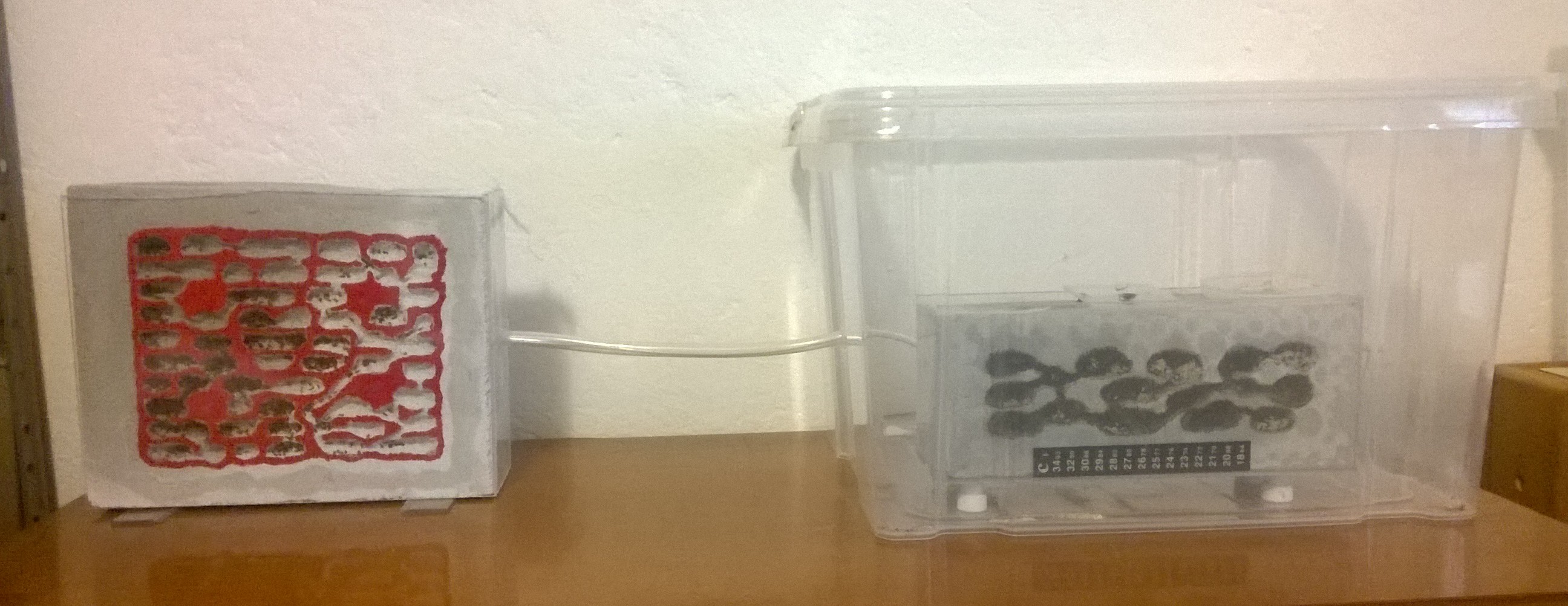 La popolazione cresce e decido di trasferirle in un formicaio più grande (quello rosso, anche questo fornitomi da lorenzoc) solo che le formiche decidono semplicemente di occupare entrambi i formicai, poi sono diventate così tanto numerose che se le forzassi a stare tutte sul formicaio più grande, credo ci starebbero a malapena e dovrei preoccuparmi di traslocarle ancora