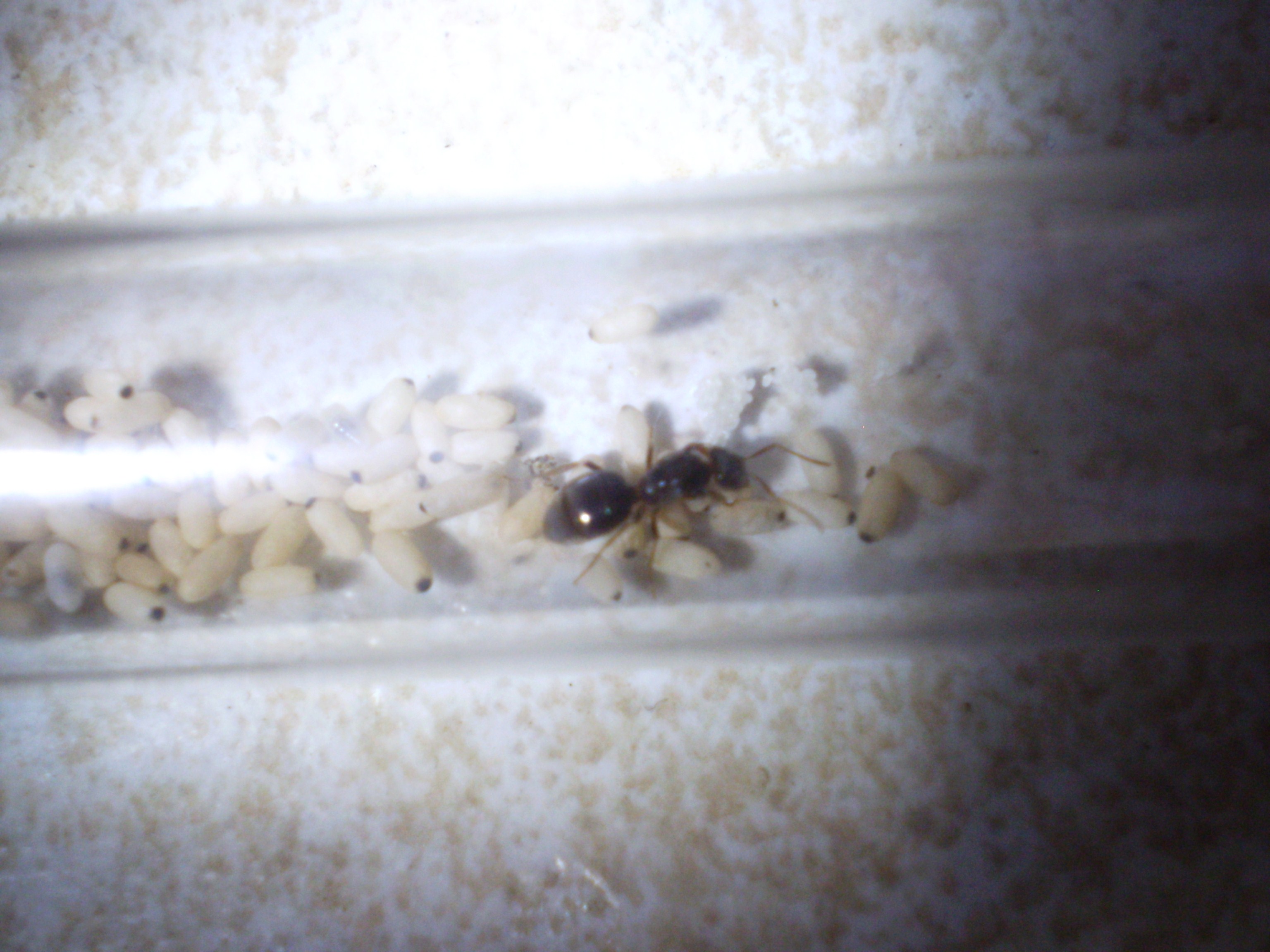 Tutt'ora la regina 1. vive con circa 50 operaie e una covata davvero abbondante comprendente circa 100-150 uova e le prime larve molto allungate molto simili a quelle notate nel diario delle Lasius fuliginosus di lucab , le operaie aiutano la regina, curano le larve e le portano avanti benissimo mentre la regina si dilata giorno dopo giorno e ora si intravede la pellicola tra i vari tergiti a dimostrazione del fatto che la deposizione potrebbe non essere terminata.