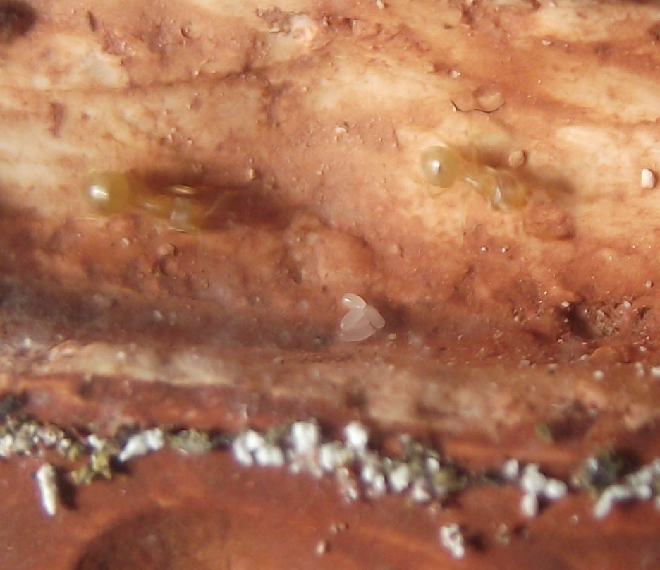 Sono aumentate le uova, e penso che le prime siano tenute separate...perchè ho trovato due operaie in una camera più in alto con un piccolo gruppetto di uova.