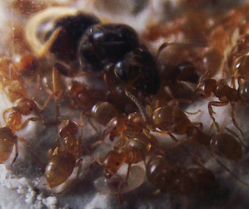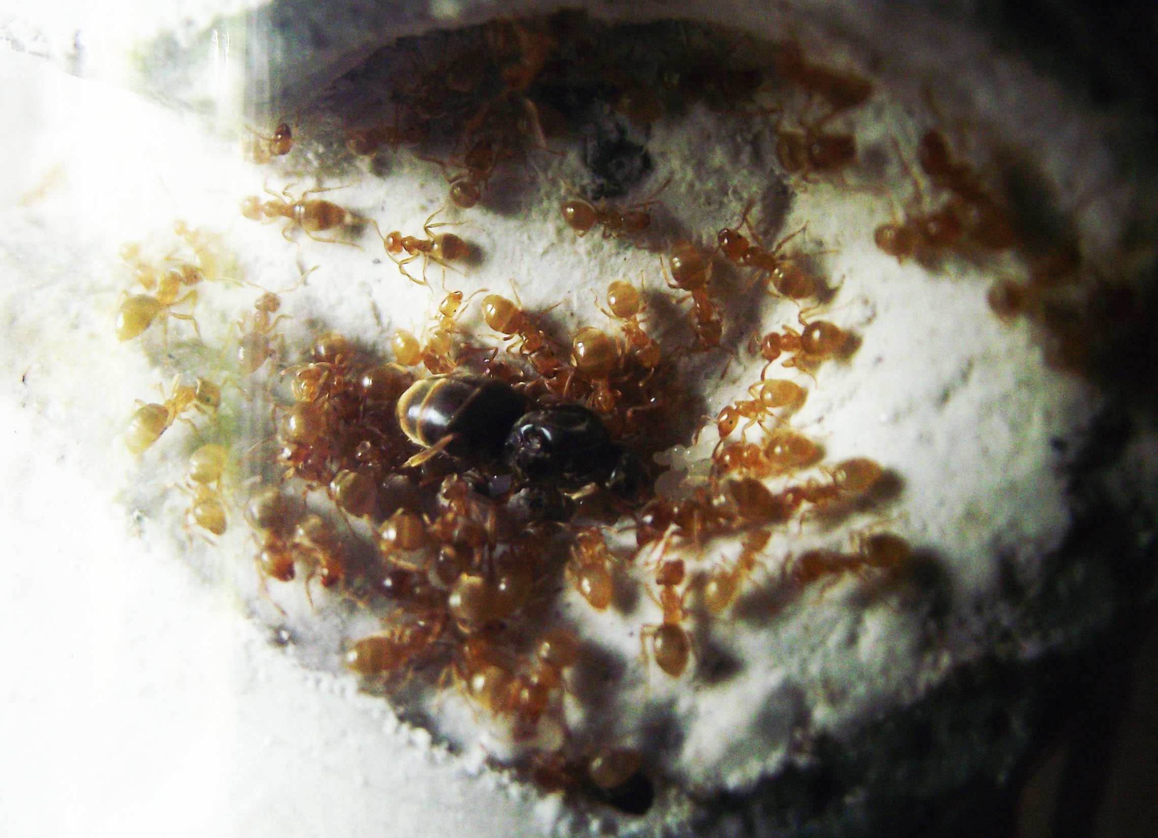 Le uova si sono schiuse e hanno lasciato posto a tante piccole larve, la colonia occupa le due camere ma a volte si stringe e ne occupa solo una,la più grande, nonostante le larve non sta mangiando più tanti cibi proteici, il miele è sempre presente in arena, sono indeciso a questo punto se farle ibernare verso ottobre fino a febbraio...devo decidere ma vorrei almeno che prima si sviluppassero questa generazione di larve.