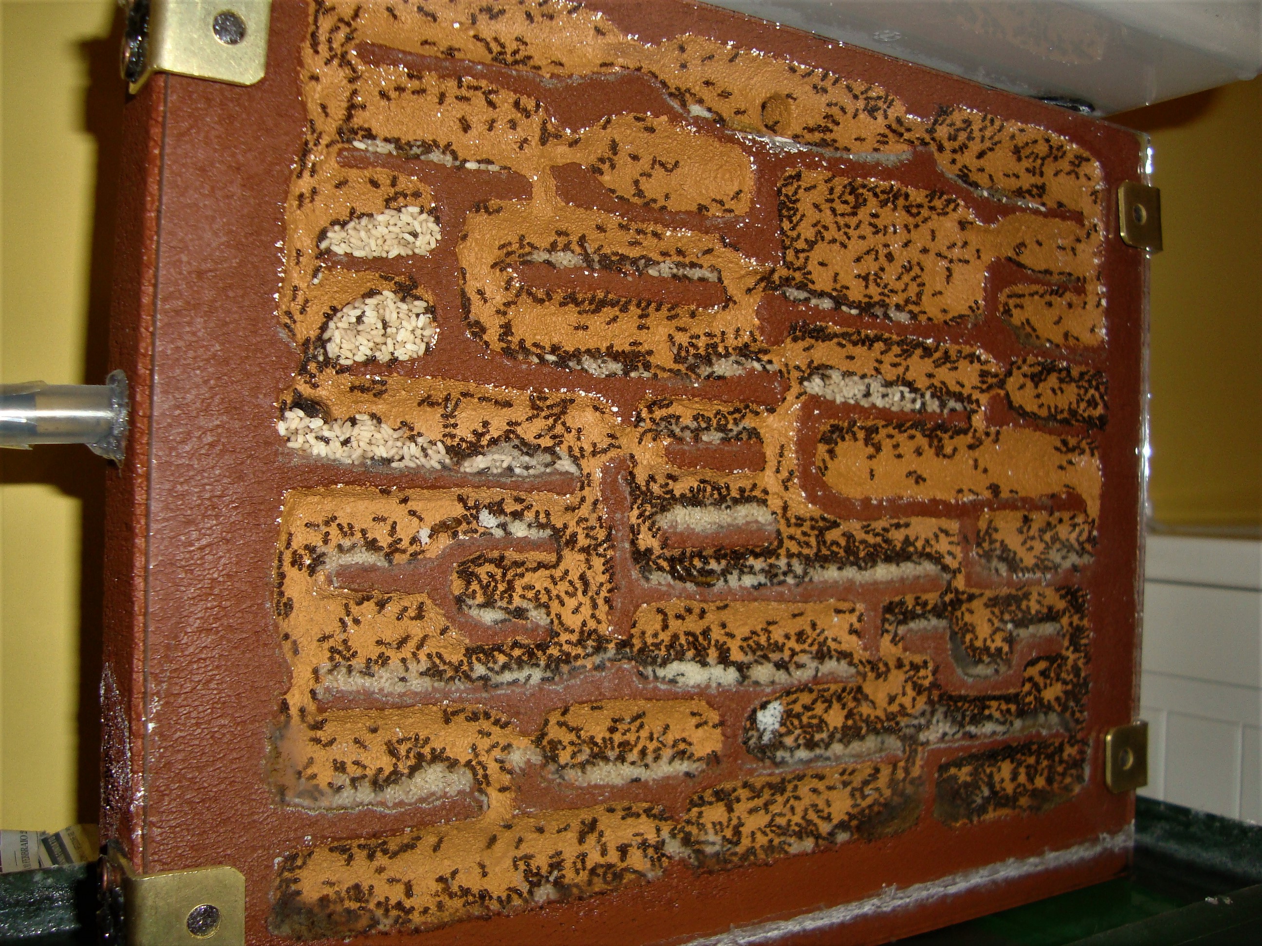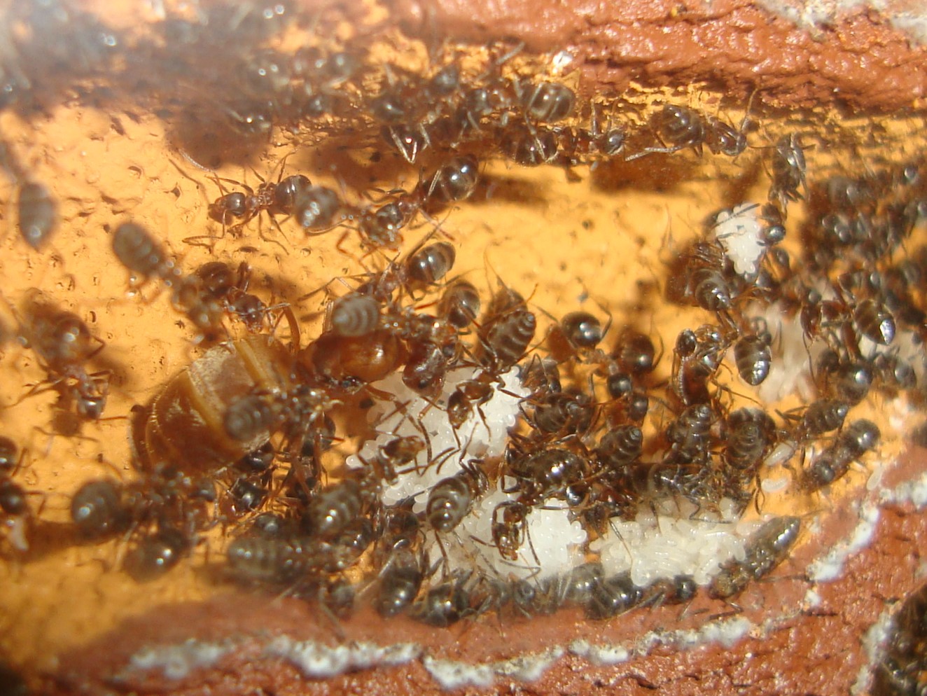 Inizialmente non se ne sono interessate più di tanto, solamente qualche operaia stazionava nelle camere umide. Più avanti hanno deciso di spostare la maggior parte della covata nelle stanze superiori e tutt'ora vi abitano i 3/4 delle operaie totali. La regina e un'ingente quantità di larvette si trovano ancora in provetta, aspetterei ancora una settimana e poi la svuoto in arena.