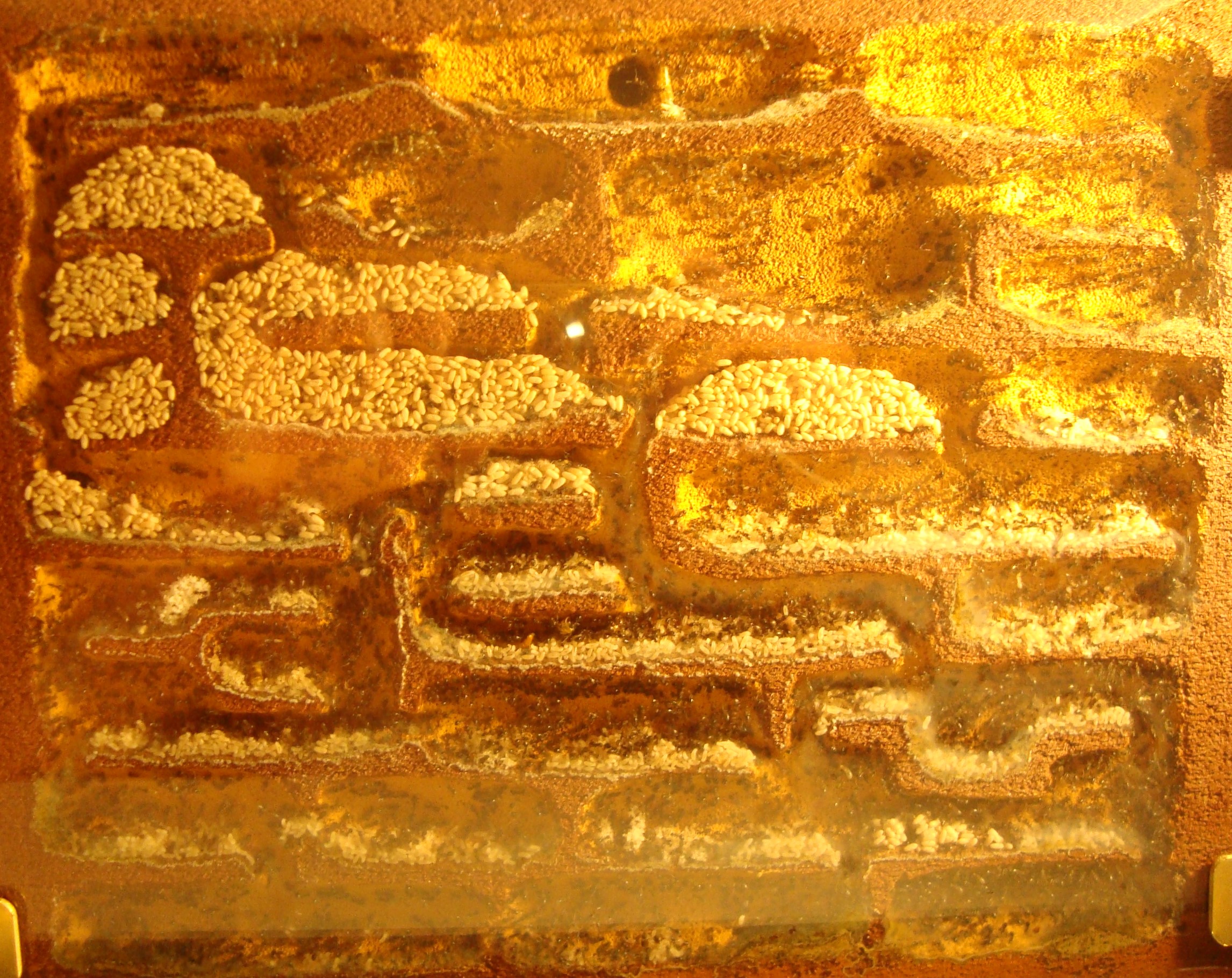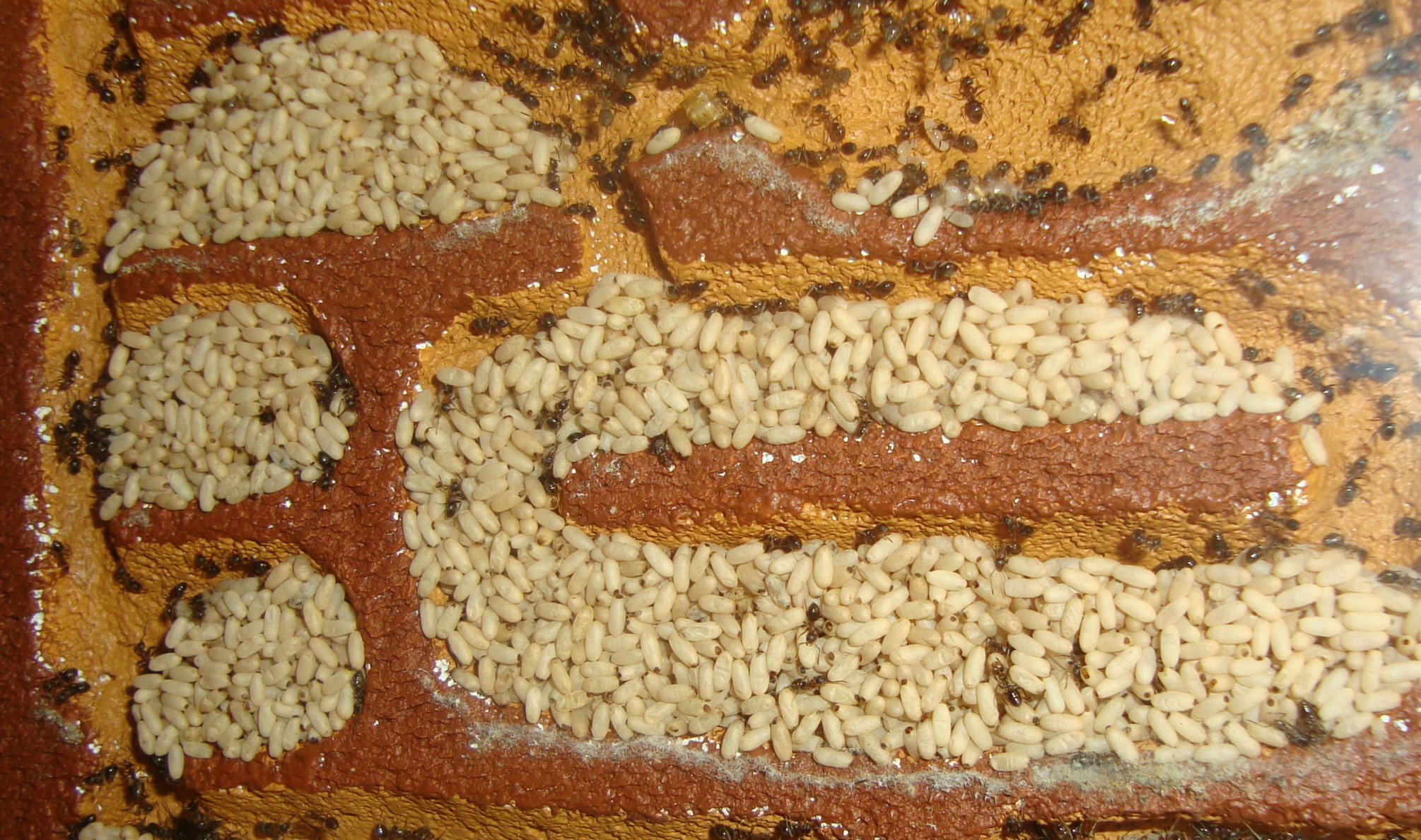 Ho avuto la fortuna di poter recuperare tutto il materiale necessario poco prima della chiusura della maggior parte delle attività. Conclusa l'opera ho atteso qualche giorno come da manuale per eliminare eventuali odori fastidiosi e ho collegato i due nidi. Questa volta sono state più restie ad abbandonare la vecchia casa, nonostante avessi iniziato a nutrirle dalla nuova arena e avessi smesso di umidificare il vecchio blocco cercando di renderlo il più inospitale possibile. Inizialmente con le larve invernali ancora inattive non si sono mosse e solo qualche sporadica esploratrice si avventurava tra i nuovi spazi. Successivamente appena iniziarono a consumare le proteine decisero, sempre con grande lentezza, di spostare la covata nelle nuove camere più umide. Bisogna dire però che prime camole e insetti vari si sono ostinate a portarli fin nella vecchia casa pur di non traslocare, operando un trasporto sicuramente svantaggioso e superfluo ai nostri occhi ma a quanto pare con un senso per loro. Un mese esatto e anche la regina si è trasferita, ultima in quanto tutta la covata era già stata trasportata compresi i primi bozzoli di stagione. Nelle ultime due settimane la marea di larve è stata accompagnata da un'ingente comparsa di pacchetti di uova presto accumulati in un solo grande agglomerato. A stima direi che si tratti di qualche centinaio di uova.