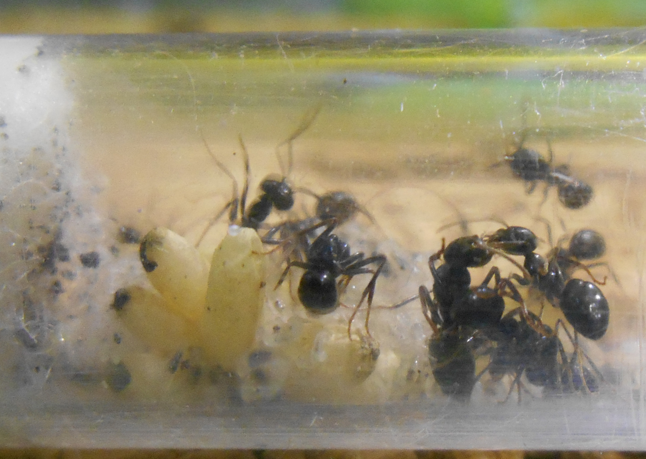 Inizio questo diario per tenere uno storico della piccola colonia di Lasius fuliginosus che ho deciso di far partire. Avendo vicino casa una colonia di questa fantastica formica ormai da quasi 20 anni, mi sono convinto che può succedere che parassitizzino anche se stesse... Ho quindi fatto una prova di adozione con operaie e prole (pupe e larve, di cui, purtroppo forse qualcuna di regina e/o maschi). Costringendo l'incontro tra regina e operaie in provetta chiusa, ci sono stati pochi comportamenti aggressivi. Solo bastati solo alcuni secondi e la regina è stata lasciata in pace. Poi lei stessa, come si è verificato sia con le L. meridionalis(??) (umbratus) e anche con le Polyergus, si avvicinava alle operaie alla ricerca del contatto. Dopo di che le operaie hanno iniziato a nutrirla e coccolarla. Poche operaie sono così affettuose come queste. Ho fatto in modo che ci fossero diverse larve in modo da garantire quel numero minimo di operaie che permettano alla regina di "partire". La colonia è nata circa 5 giorni fa e l'unico problema che ho è quello di fornire proteine. Vedremo. Ho caricato anche un breve video che mostra l'interazione tra i suoi componenti.