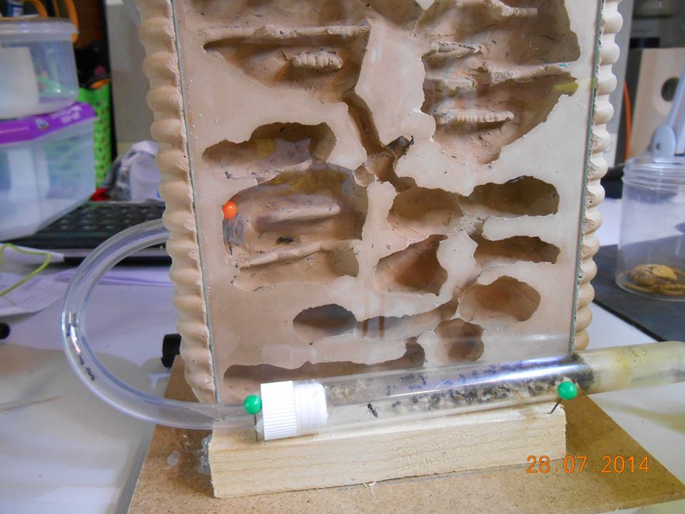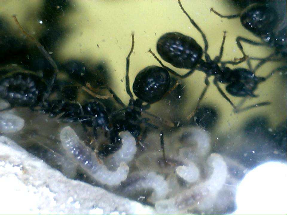 2014-06-14 - Tutto procede bene, anche se mi inquetano un pò alcuni fattori. Un paio di operaie sono morte, sono nati due maschi, ci sono ancora molte larve e non mi sembra che le operaie bottinino abbastanza. Per contro vedo che ci sono varie operaie con il gastro dilatato e che alcuni pezzi di camola sono stati portati dentro il formicaio.
