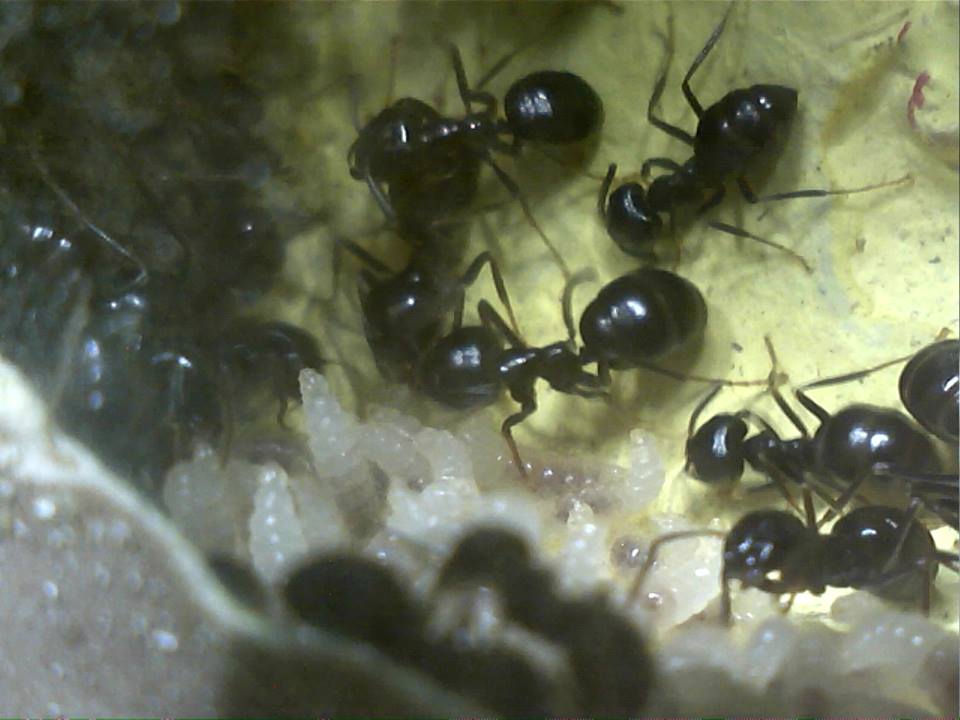 2015-03-09 - Ecco sua maestà circondata da varie operaie super attive. Si vedono fuori fuoco anche le uova, le ne tiene in bocca una. Come altre regine di questa specie sono molto attente alla prole e anche dopo che ci possono essere altre formiche che si occupano di loro, la regina non manca mai di ripulirle e coccolarle